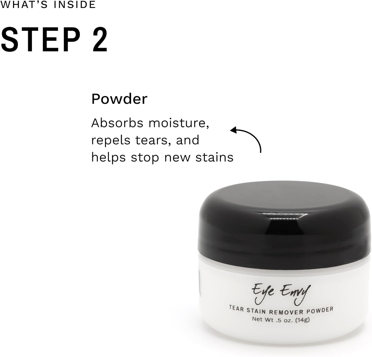 - TWO-STEP SYSTEM: Tear Stain Solution cleans the affected area and helps fight the root cause of the staining; apply with included applicator pads. Tear Stain Powder absorbs excess moisture and helps repel new tears. It is NOT a chalk or cover up, but a natural silk-like powder that safely keeps your petโs eye dry, stain-free and full of luster.