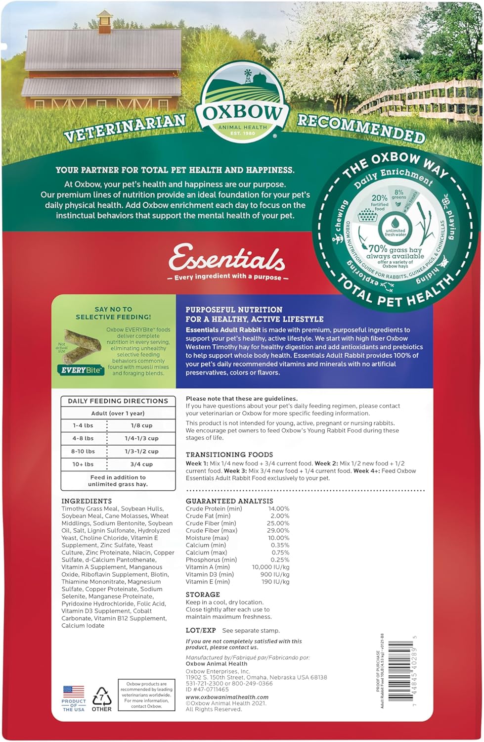 Oxbow Essentials Rabbit Food, Adult, Made with Oxbow Timothy Hay for Rabbit, Pet Pellets with Vitamins & Minerals, Small Animal Pet Products, Bunny Food, Made in USA, High Fiber, 10 lb. bag