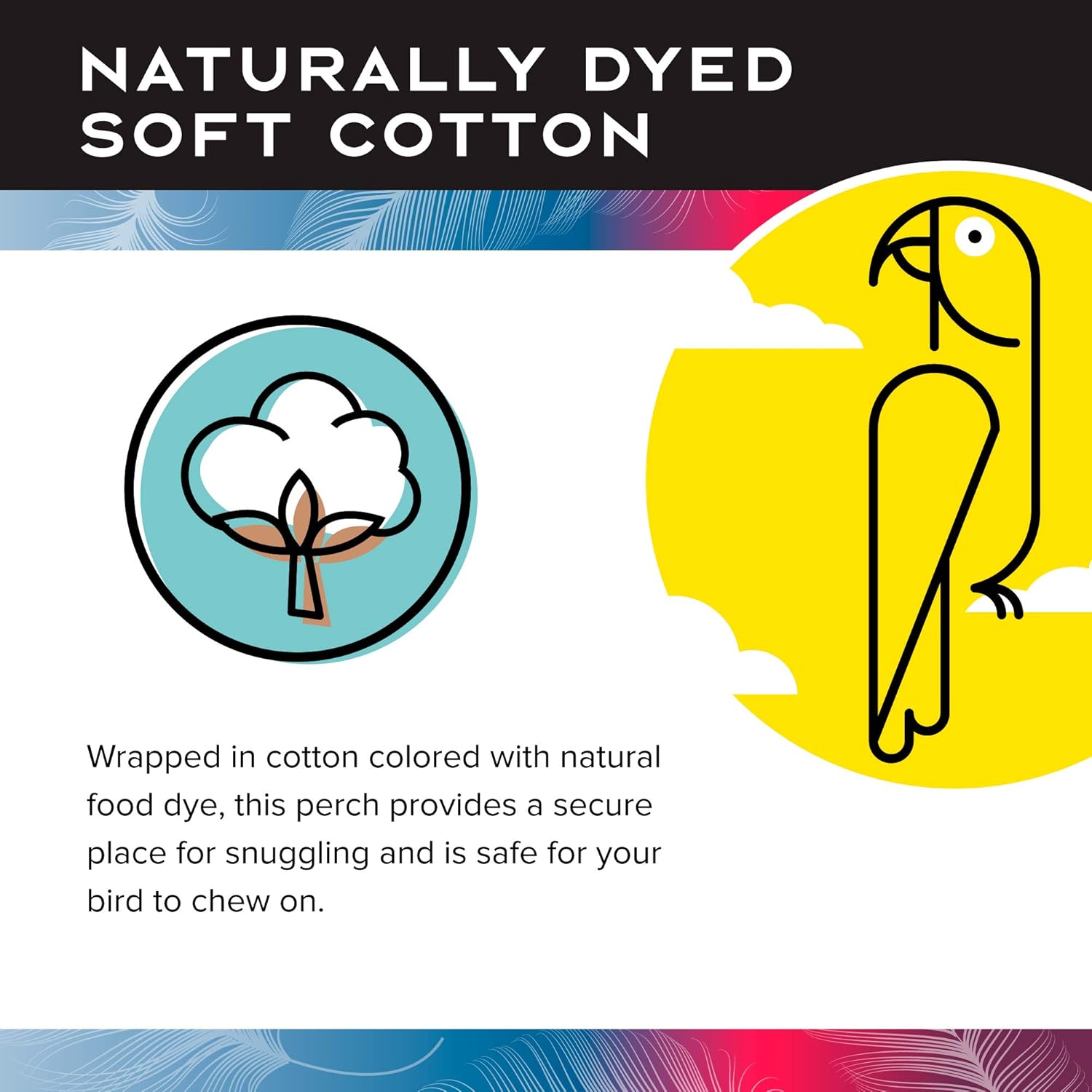 - NATURALLY DYED, SOFT COTTON: Wrapped in cotton and colored with natural food dye, these act as perches, rings, and large bird toys; Our soft cotton ring provides a secure place for snuggling and is safe for your bird to chew on