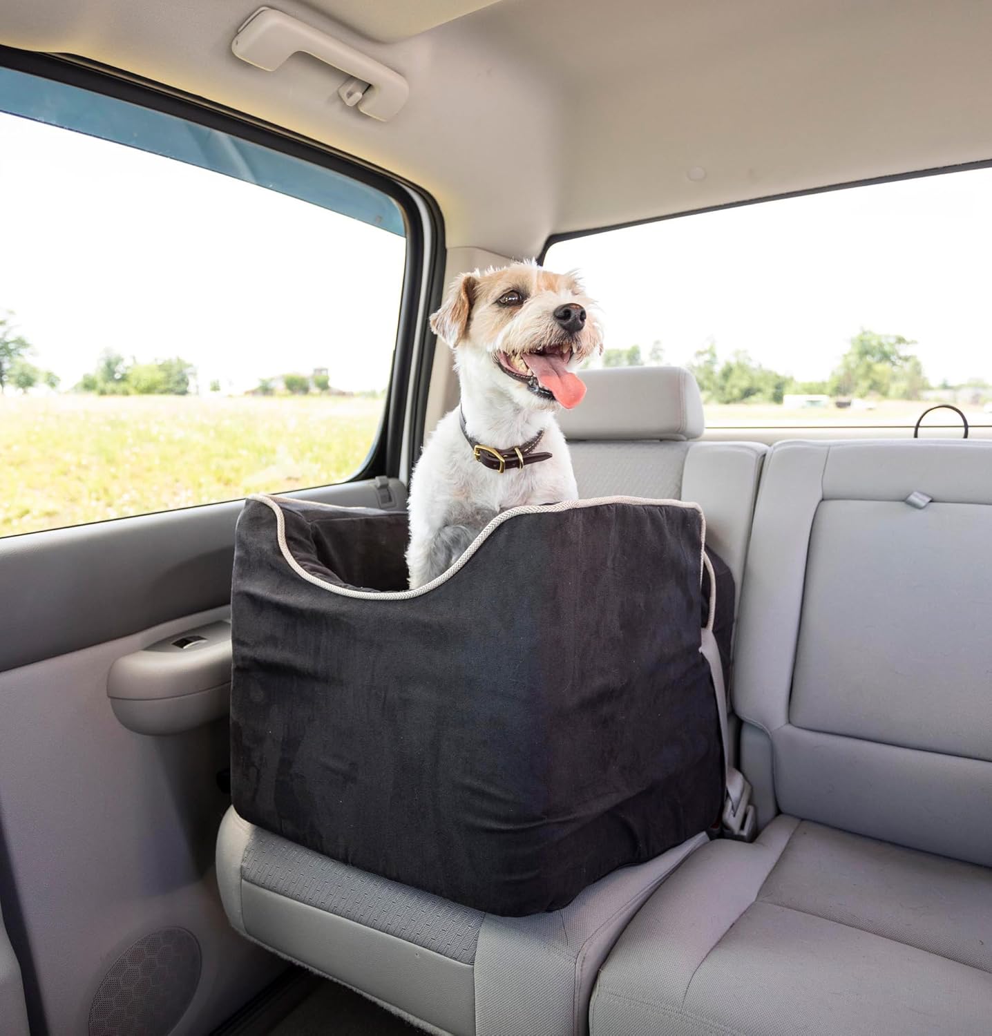 - Elevate your pup's car journey with the luxurious Lookout I dog booster car seat. The elevated dog car seat provides a raised seat for your dog to see out the window. Seeing out the window from a raised dog car seat can alleviate anxiety and ease car sickness for dogs who struggle with car rides. More than a seat, it's a cozy dog bed for car journeys that is crafted from plush, soft fabric and shock-absorbing foam to ensure a smooth, comfortable, enjoyable car ride for your furry family member.