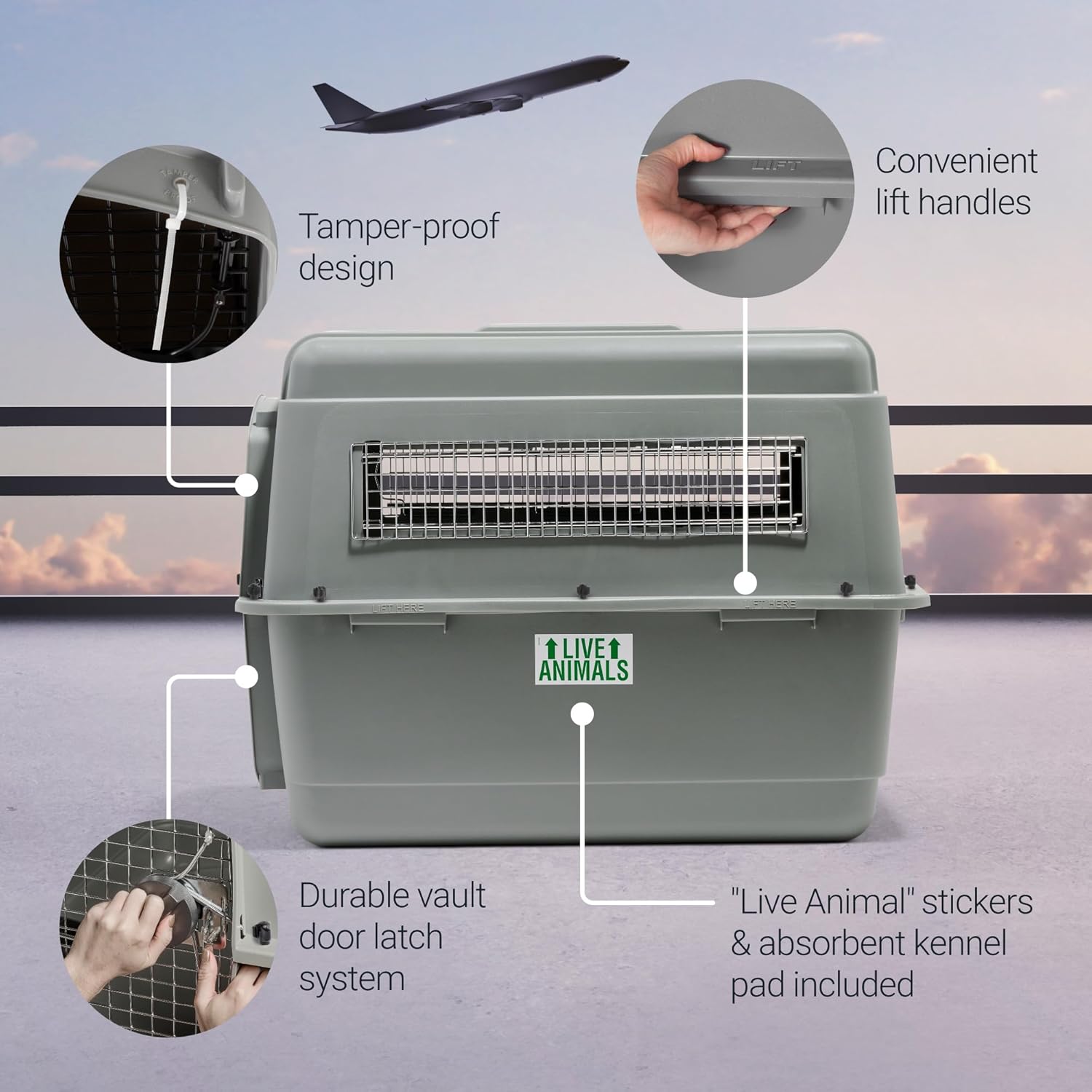 - EASY TRAVEL PREPARATION: The Sky Kennel is a travel dog crate that comes with essentials including two 'LIVE ANIMAL' stickers, a food and water cup, ID stickers, and an absorbent pad to provide a great travel experience for you and your pet