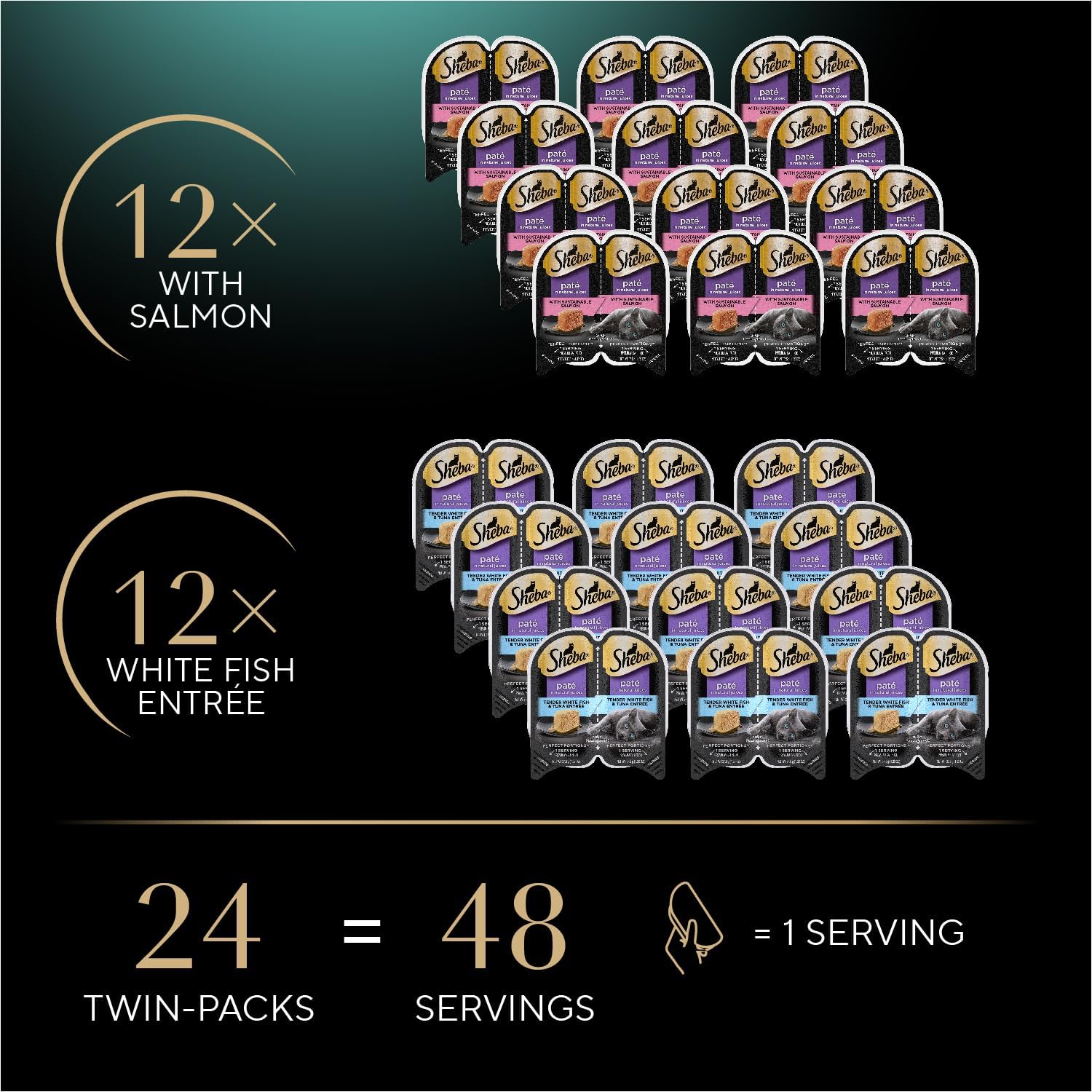 Sheba Perfect Portions Wet Cat Food Pate with Sustainable Salmon and Tender Whitefish & Tuna Entree Variety Pack, 2.6 oz. Twin-Pack Trays (12 Count, 24 Servings) (Pack of 2)
