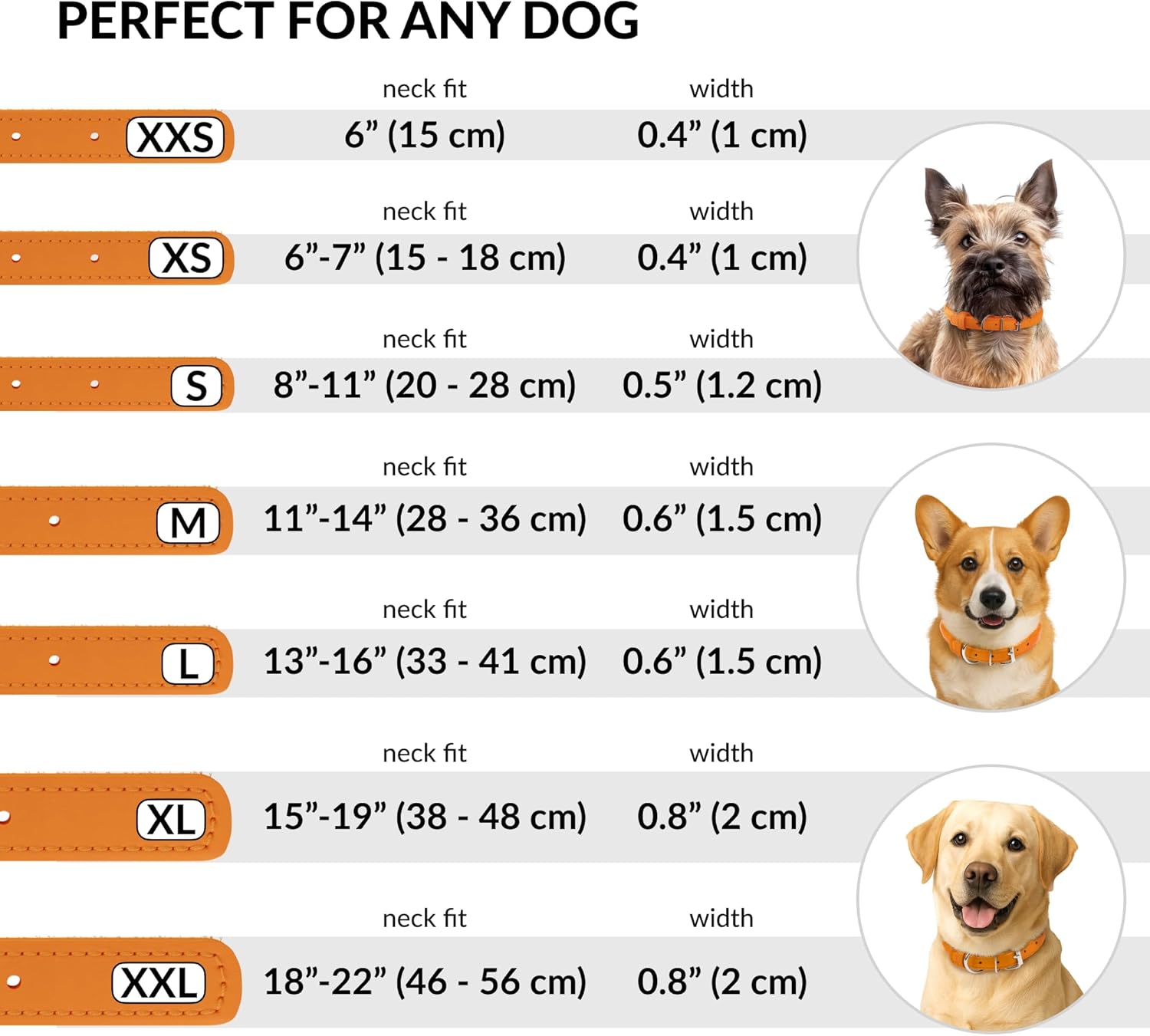 - SUITABLE FOR ALL BREEDS: Our dog collars for small dogs and big dogs come in a variety of sizes. Please check out our size chart before purchasing a leather collar for dogs. The dog collar leather is 0.6 inches wide, 17 inches long, and neck sizes of 12 - 15 inches.