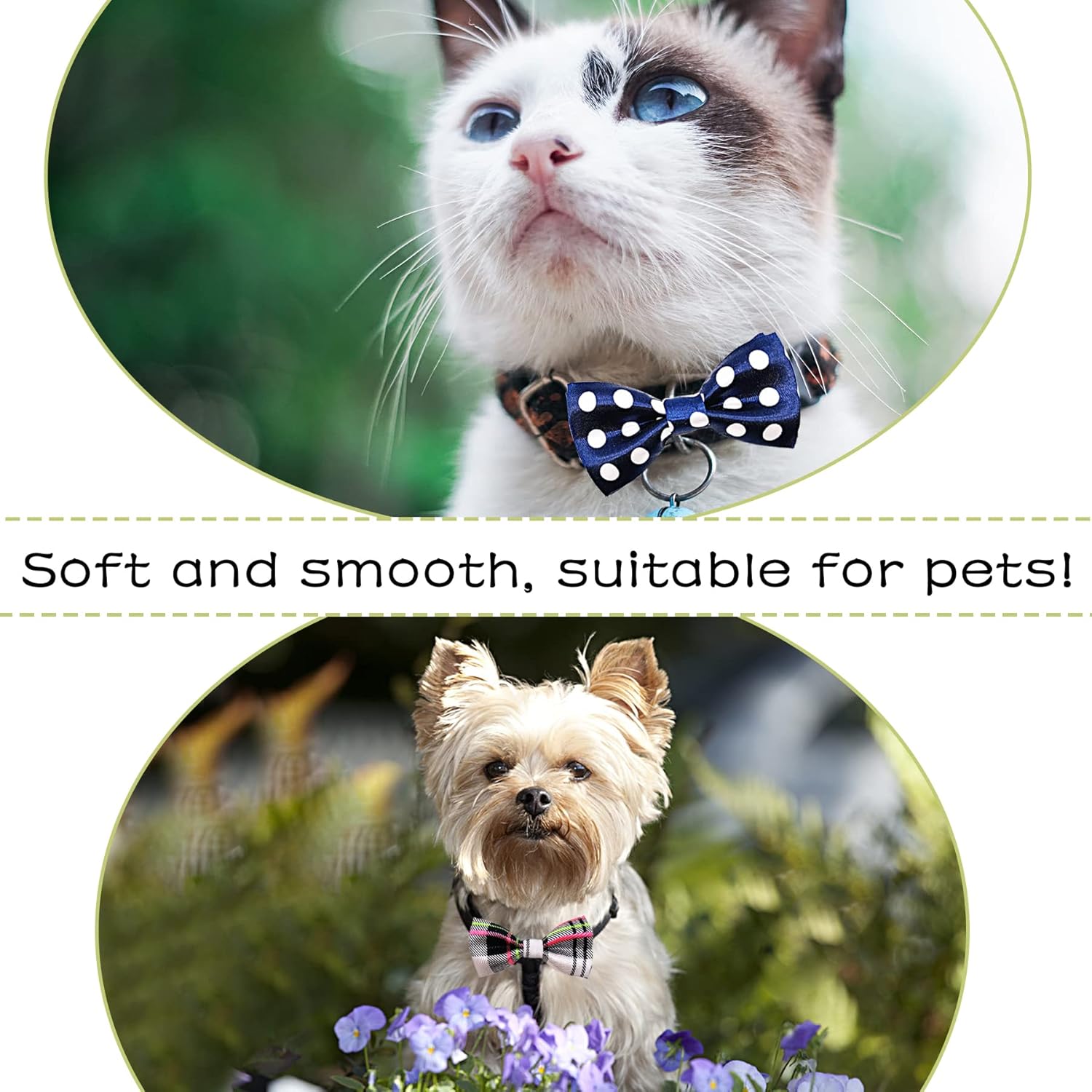 - The collar charms bowties is about 3.5*1.7inches. They fit for small and medium dogs, puppies, cats, rabbits and pigs well. The elastic rubber bands on their back usually fit for 1.5-3cm (0.59-1.2inches) wide collars. They can be slipped on collars easily.