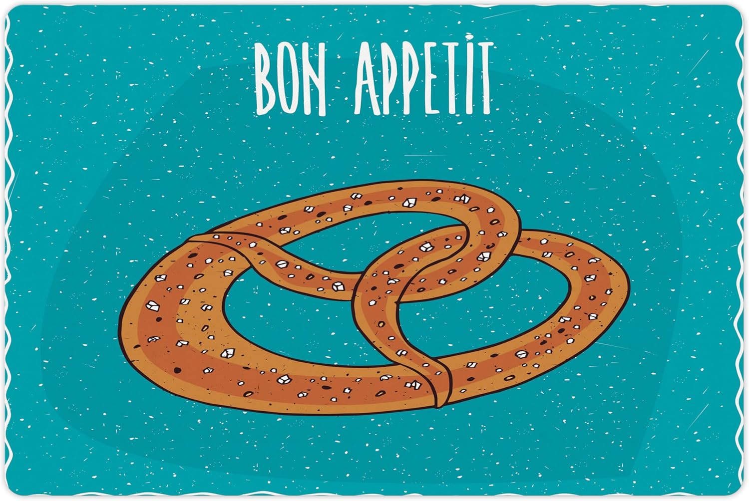 Lunarable Bon Appetit Pet Mat for Food and Water, Pretzel Design Bon Appetit Lettering Hand Drawn Cartoon Food Words, Non-Slip Rubber Mat for Dogs and Cats, 18" X 12", White Brown
