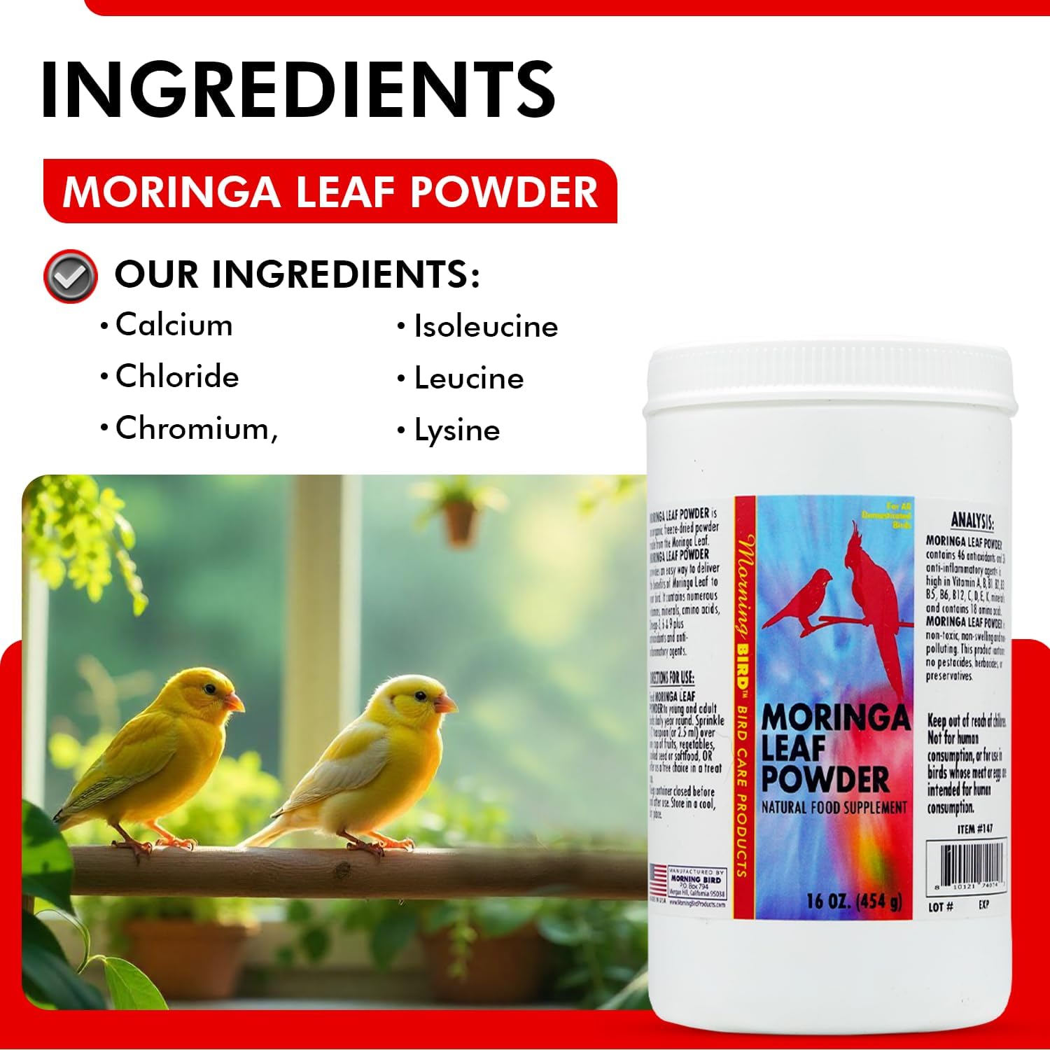Morning Bird Moringa Leaf Powder 16 Oz – Natural Food Supplement with Omega-3, Iron, Vitamins B & K – Supports Detox, Energy, Brain & Immune Health – Clean Plant-Based Supplement for All Birds