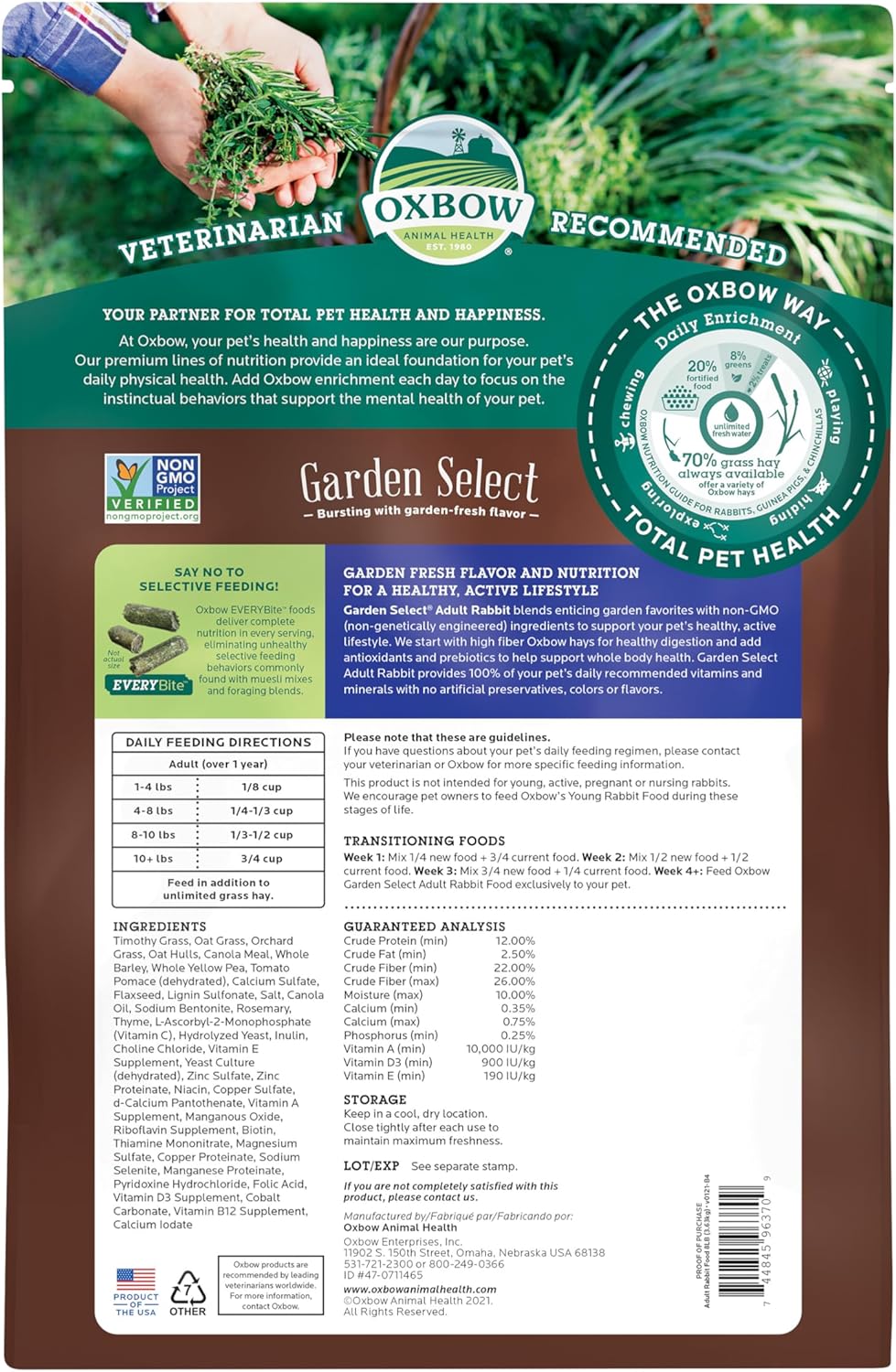 - NON-GMO: Oxbow Garden Select Adult Rabbit Food is made with non-GMO ingredients you can trust; These rabbit and bunny pellets provide a natural, unaltered diet that supports your petโs health while meeting the highest standards of quality and care