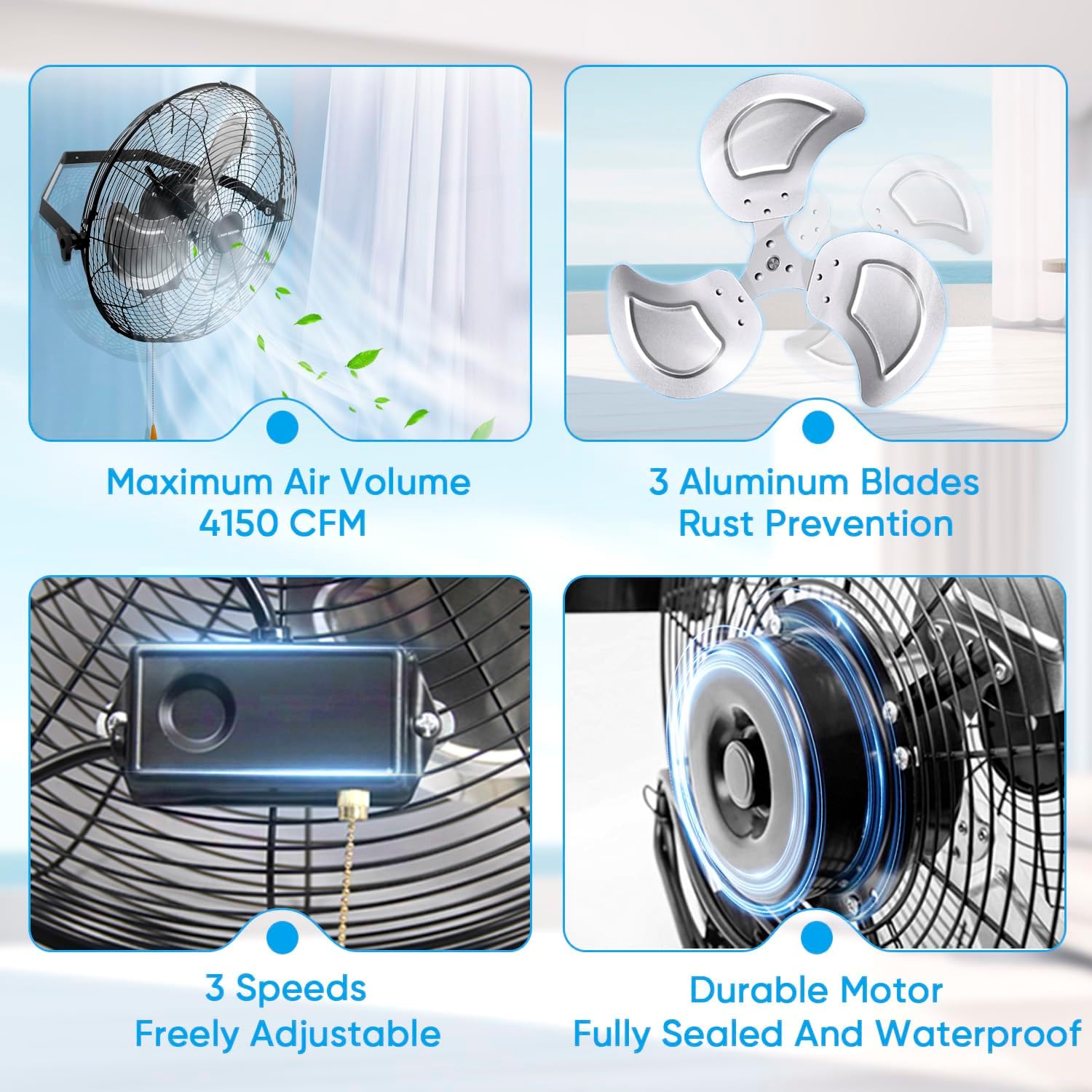 - ćSUPERIOR PERFORMANCEćWall Mounted High Velocity Fan, 3-Speed adjustable with pull chain control featuring three different speeds,full sealed motor produce up to 4012 CFM of airflow, 7.3m/s air speed; powerful and strong ventilator.The pull chain is 60 centimeters which is very convenient for you to control the industrial fan.