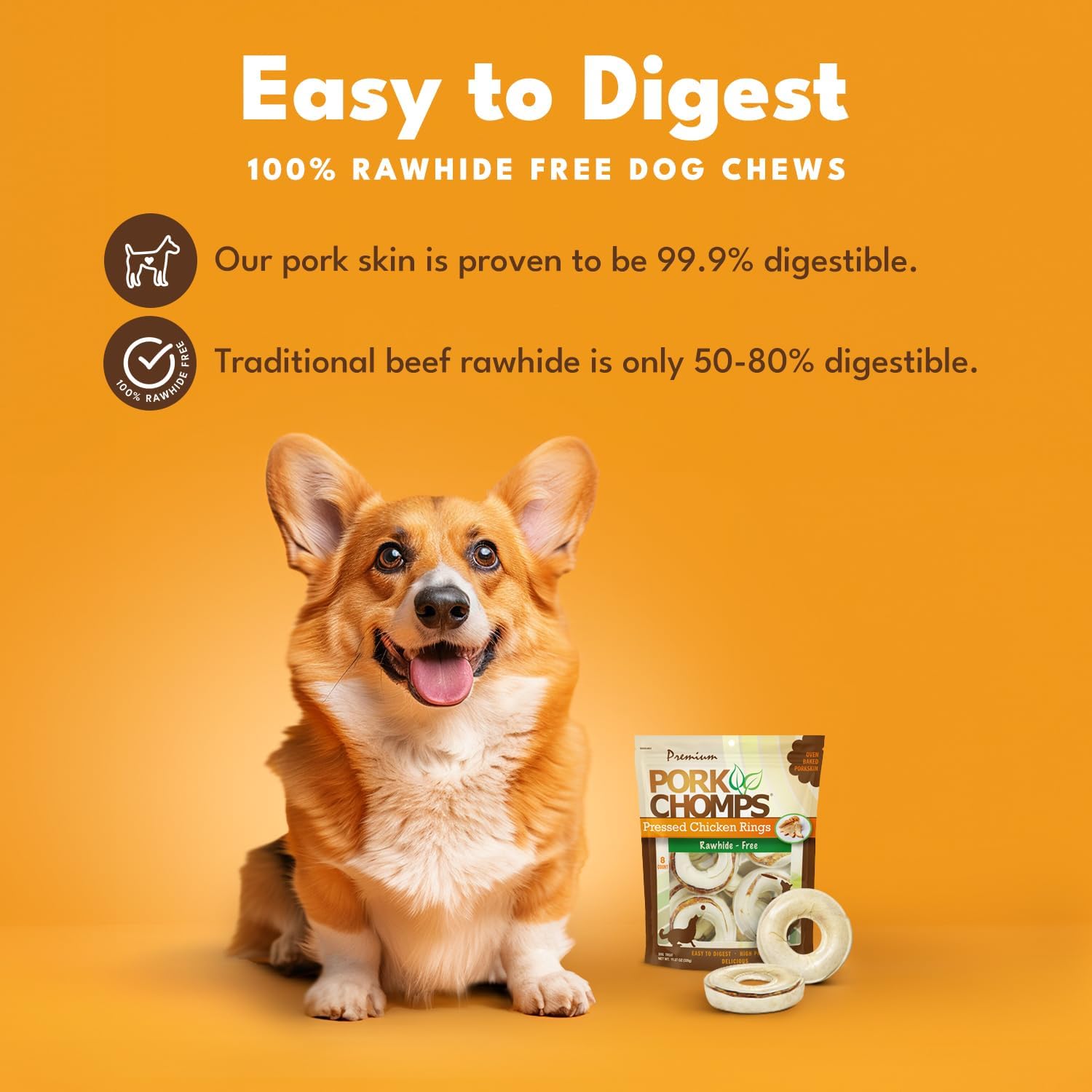 Pork Chomps Pressed Pork Skin Dog Chews, 2.5-inch Rings, Real Chicken, 8 Count