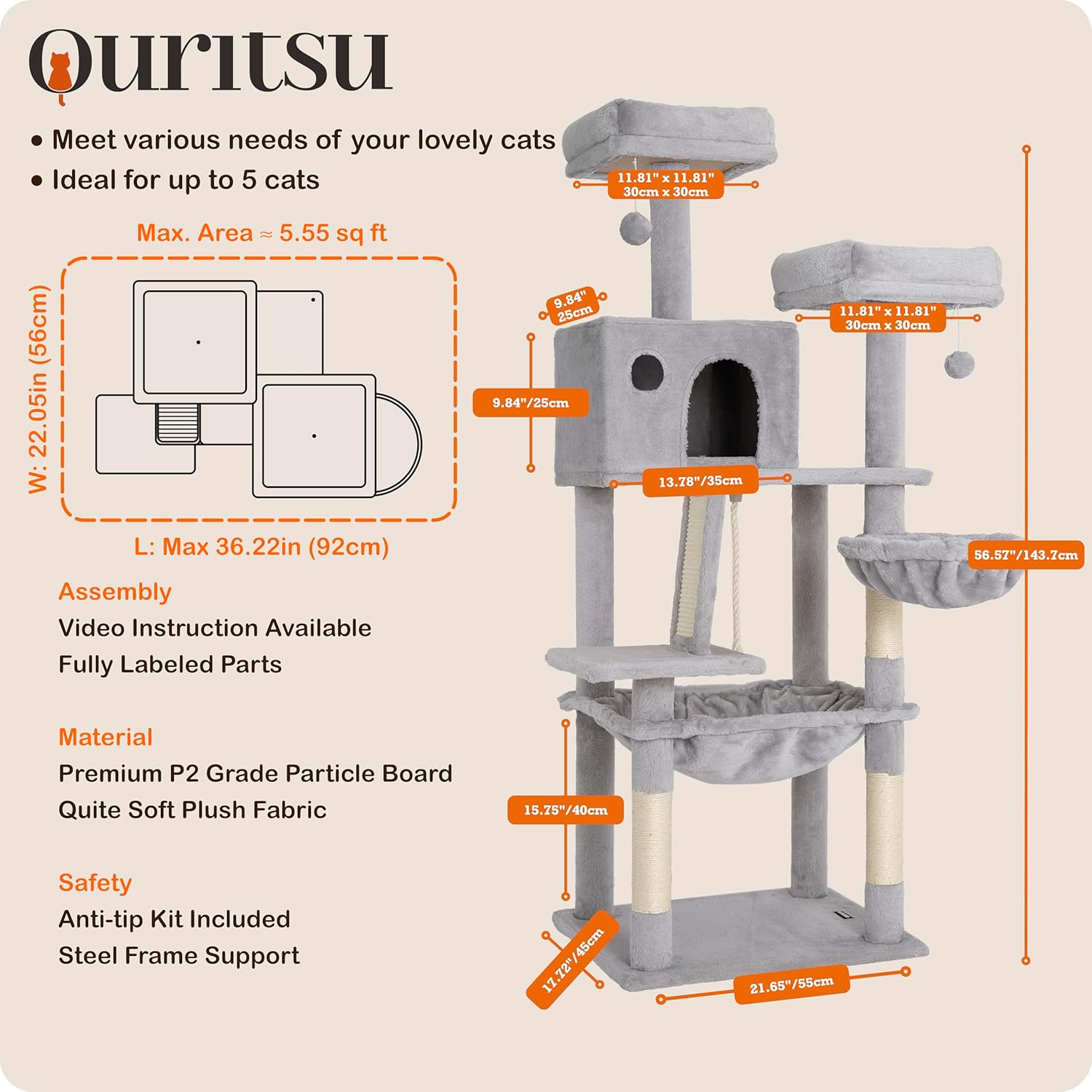 Ouritsu Cat Tree, 56 inch Tall Cat Tower for Large Cat Indoor, Large Condo, 2 Padded Perches, Steel-Framed Hammock, Scratching Post and ramp, Fluffy Basket, Light Gray, LF001GA