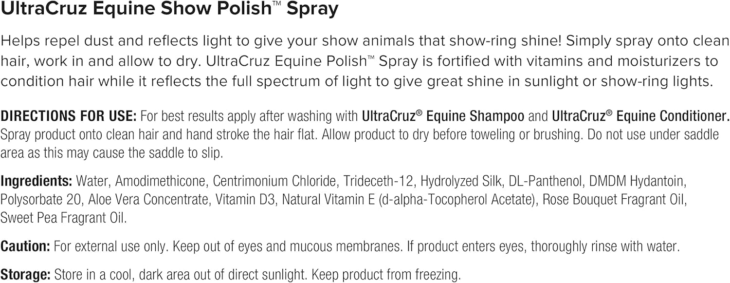 - Equine Show Polish detangles hair and helps repel dirt and dust
