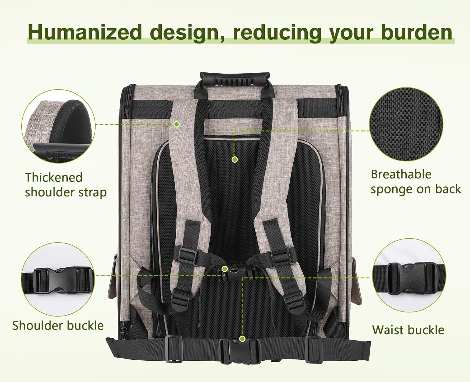 - γ ERGONOMIC DESIGN γ: The widened & padded shoulder straps and back provide support and help reduce load and increase comfort. 2 retractable buckles on the top and bottom of the cat backpack to prevent shoulder strap deviation and maintain the stability of the dog carrier.