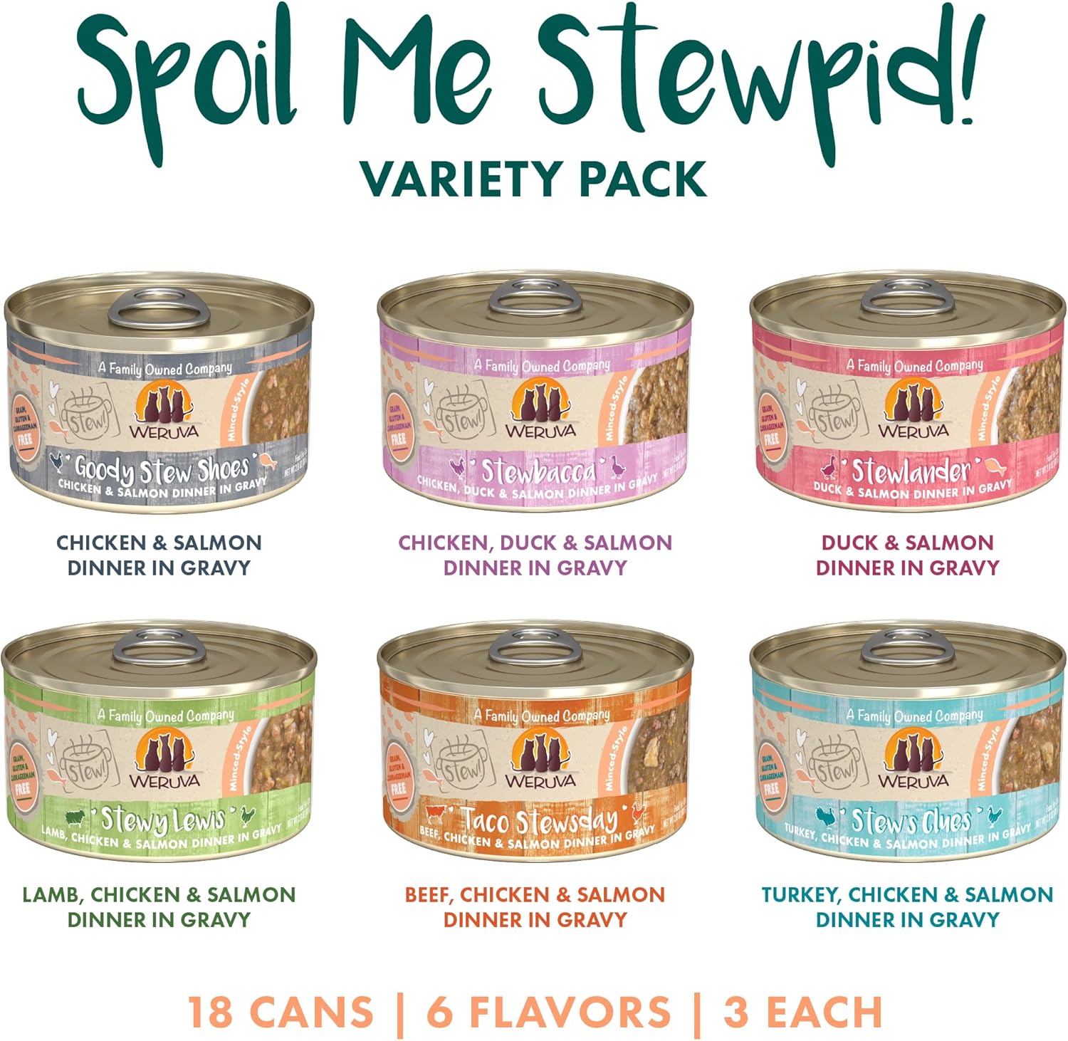 - Spoil Me Stewpid! Variety Pack (3oz cans, pack of 18) Weruva’s Stew Sampler! Spoil your cat with six different super premium cat food stews!