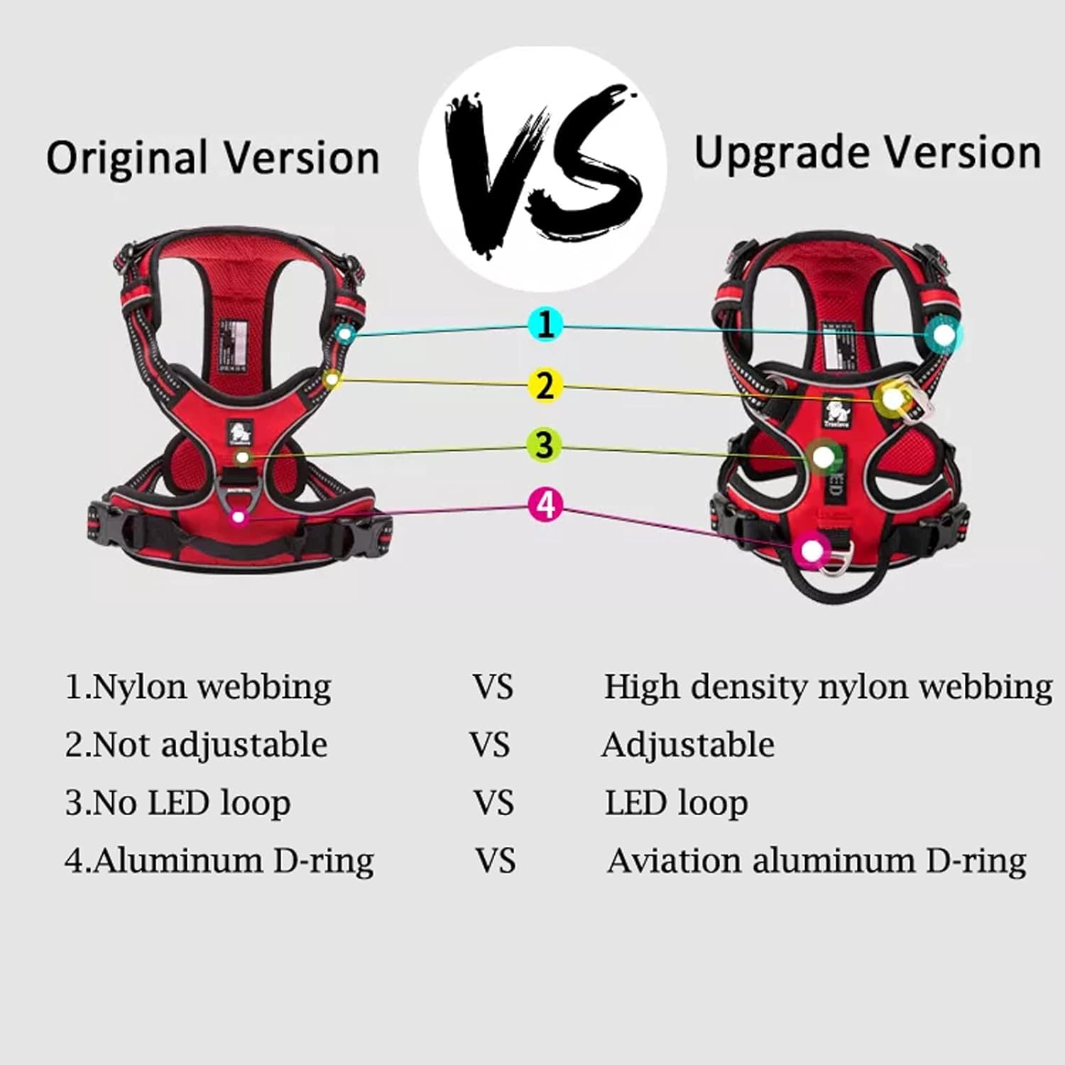 - 1. Light weight Aviation aluminum fittings on neck strap make the dog harness easier to put on and take off. No need to go through the dog's head, no need to make any adjustment when put on or take off.
