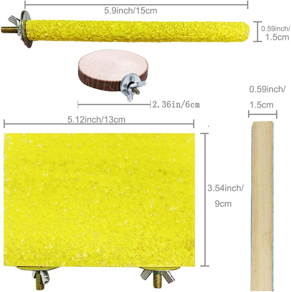 - 8 PACK BIRD PERCH STAND TOY : Perfect bird cage accessories toys to decorate your birds cage. You can get 6 parrot perch toys with one purchase.The parrot perch stand platform is 5.12 Γ 3.54 Γ 0.59 inch and two types of boards allow your pet to choose freely. The length of the paw grinding stick is 5.9 inch and the diameter is 0.59 inch