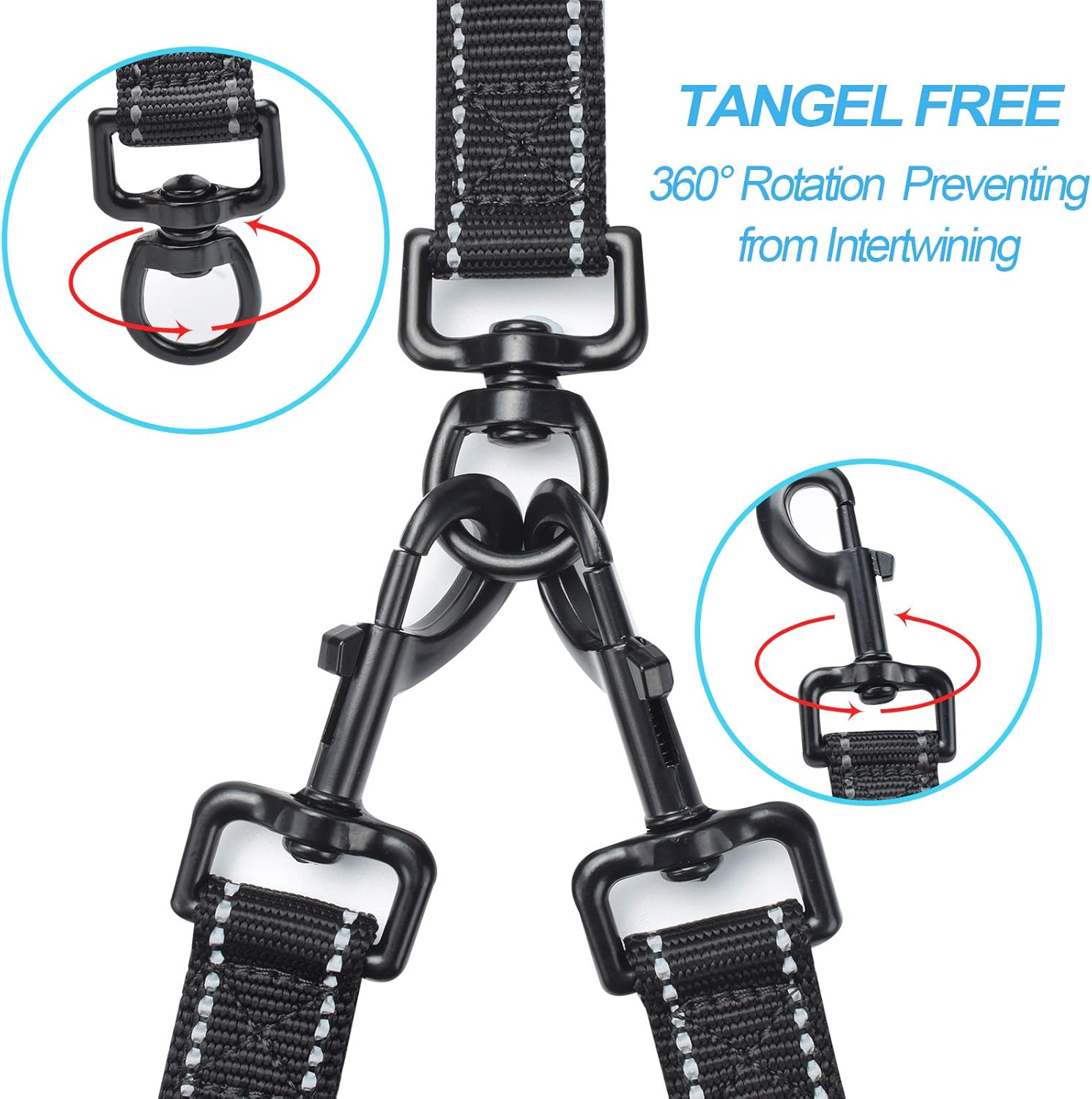 - No Tangle Double Dog Leash: 360Β° swivel clasps help to keep your dogs from getting tangled together. No need to worry about getting twisted two dog leash when dogs switch sides