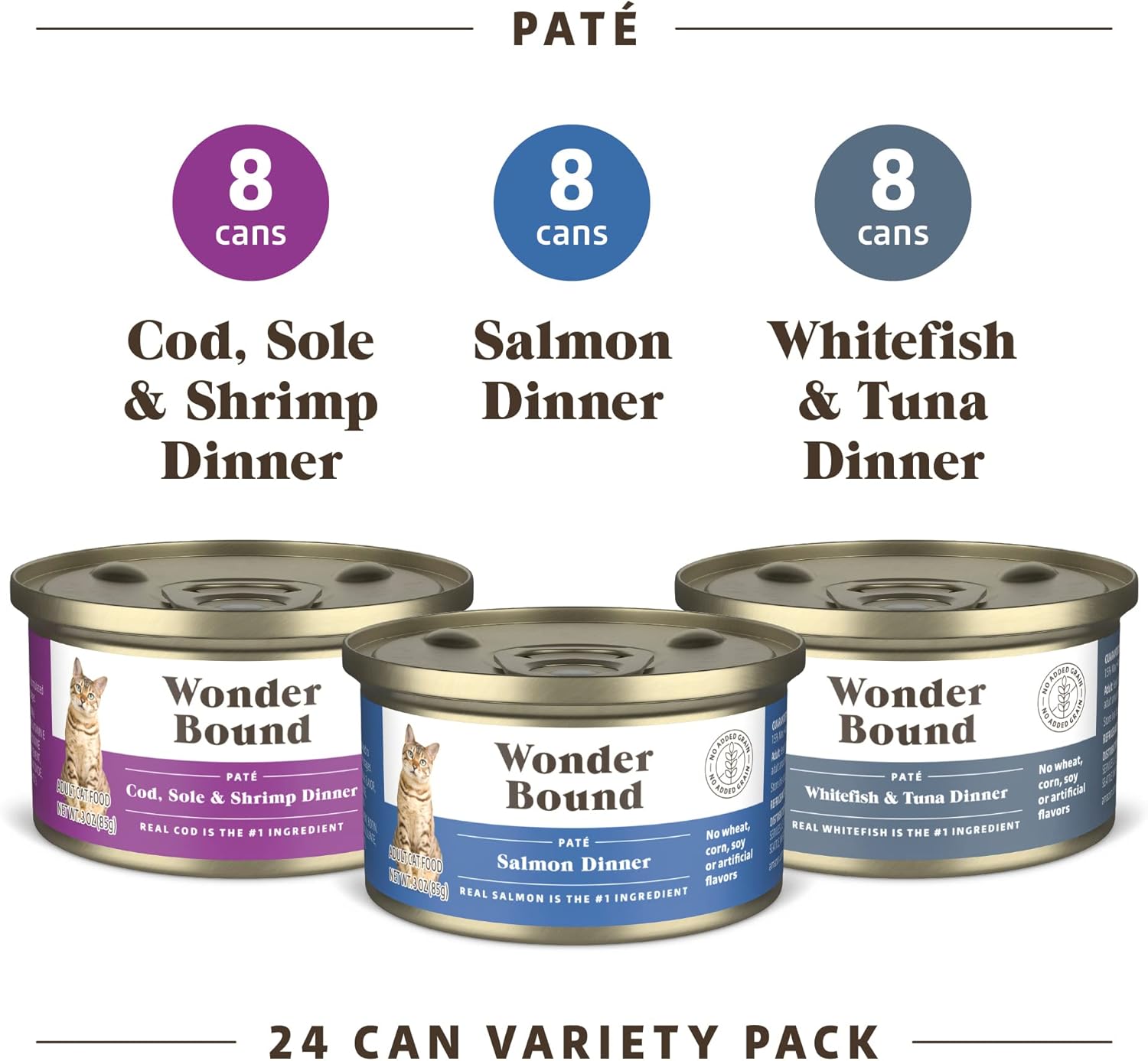 - 24 Pack of Wonder Bound Grain Free Cod, Sole & Shrimp, Salmon, White Fish & Tuna Paté 3 oz cans, Variety Pack Wet Cat Food
