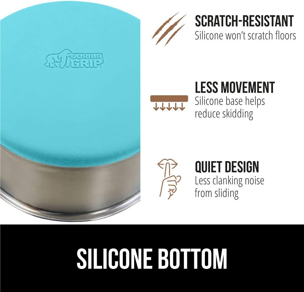 - SILICONE BOTTOM: the Gorilla Grip bowl is constructed from durable silicone that helps keep the bowl steady and wonโt scratch your floors; while some over eager eaters may still be able to slide the bowls, the silicone will help prevent much movement; plus, it reduces the noise from clanking and sliding across wood, tile, and more