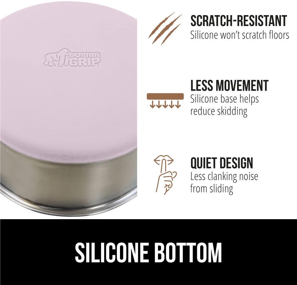 - SILICONE BOTTOM: the Gorilla Grip bowl is constructed from durable silicone that helps keep the bowl steady and wonโt scratch your floors; while some over eager eaters may still be able to slide the bowls, the silicone will help prevent much movement; plus, it reduces the noise from clanking and sliding across wood, tile, and more