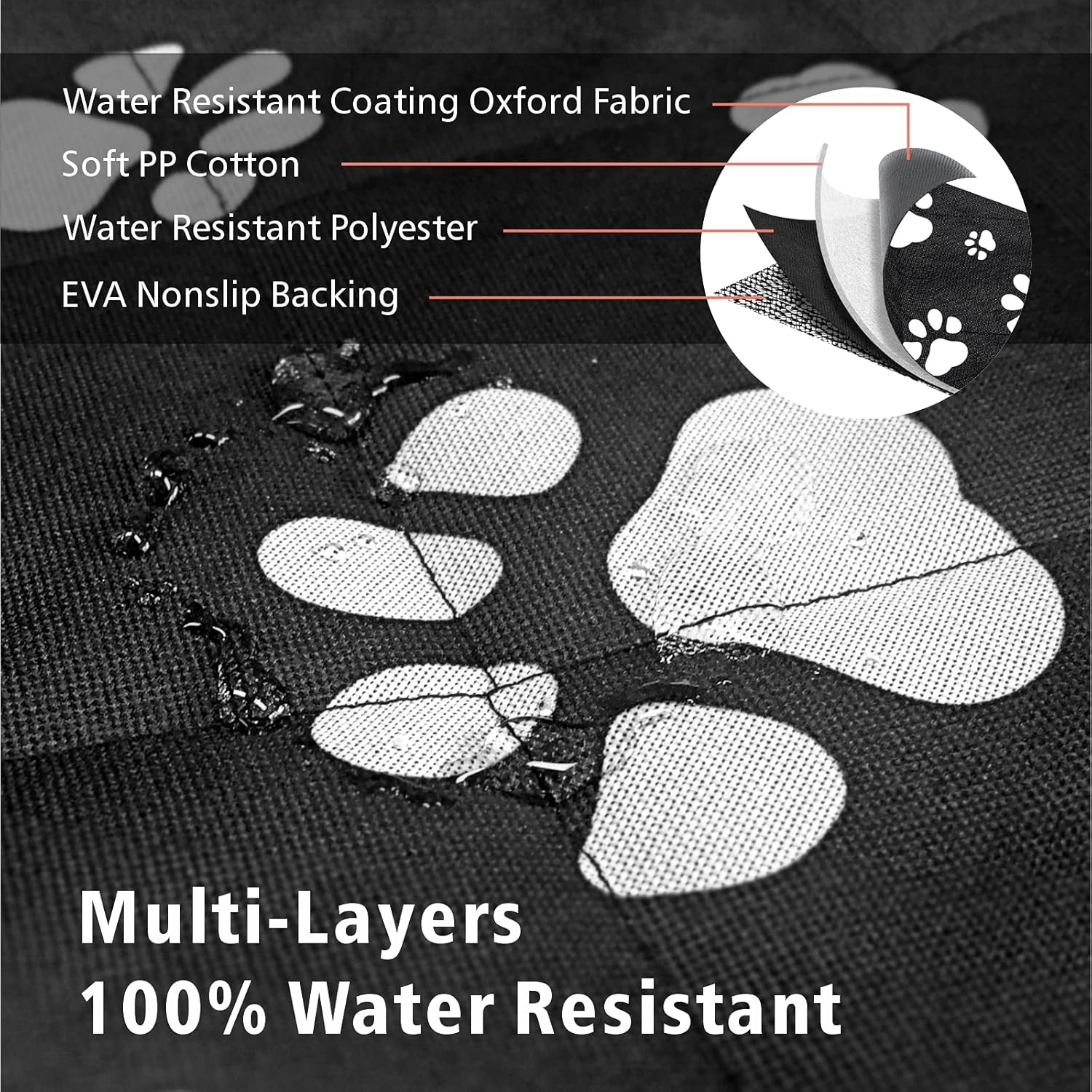 - Water Resistant Cargo Liner: 4 water-resistant layers quilted, WATER RESISTANT and protects your car seat from pet dander, hair, spills, oders, mud and water; Easy to clean just by wiping away dirt or vacuuming, washable. Tips: If there's a pee accident, please clean immediately.