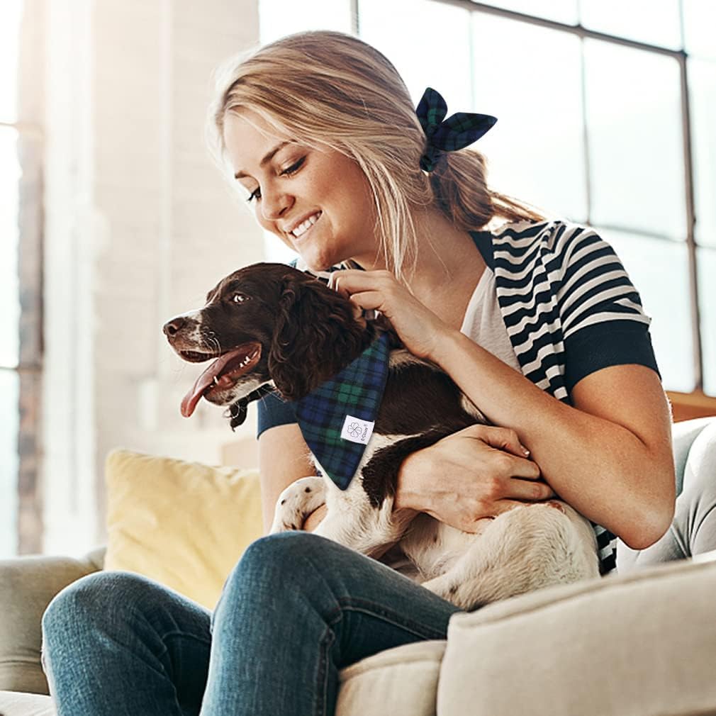 - Matching Bandana and Scrunchie Set- It’s full of love when your pets is wearing the dog scarves and you are wearing the bow scrunchies. When traveling, sleeping, taking photos or daily walking, adorable dog scarf and plaid scrunchie is a pretty accessories. The scrunchie can be worn as a wrist accessory and hold your hair. Beautiful dog drool bibs and bow scrunchie with green and blue tartan pattern, it’s nice photo props for holiday.