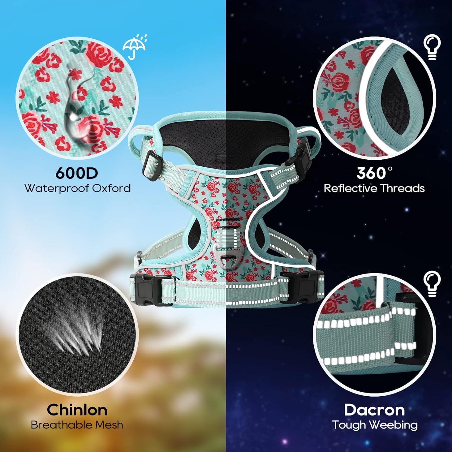 - 【MUCH SAFER & MORE COMFORTABLE】 Breathable mesh lining with soft sponge padding plate of puppy harness prevents injuries, giving extra comfort and protection with enhanced 1600D oxford fabric. The reflective material will be really nice when it gets dark. Also, your dog will be saw easily. This reflective material can make drivers have long time to react, which ensure your dog’s safety!