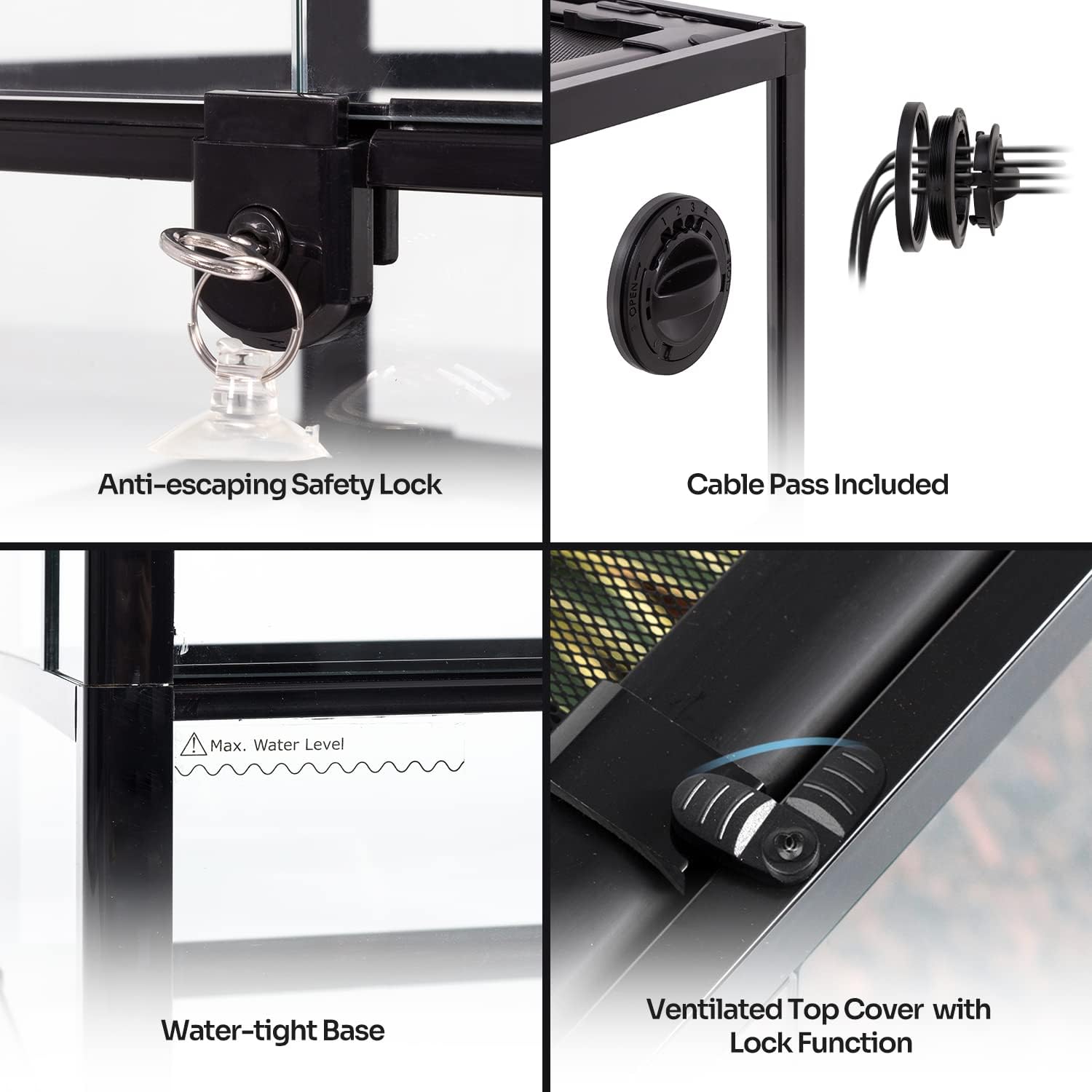 - The front doors can open separately, itβs easier for you to feed, clean, decoration or maintenance. The terrariums feature anti-escaping safety lock to prevent escape.