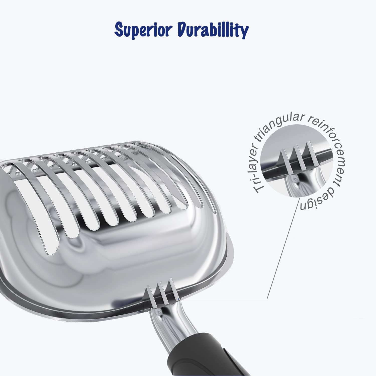 - [Features]: WePet made this scooper durable with heavy duty quality. After investigation with thousands thoughtful users, we finally make an improvement of removing the serrated edge as mentioned on reviews. The body is waterproof and very easy to clean, rust-resistant and corrosion resistant. Itโs highly recommended by cat lovers for everyday use.