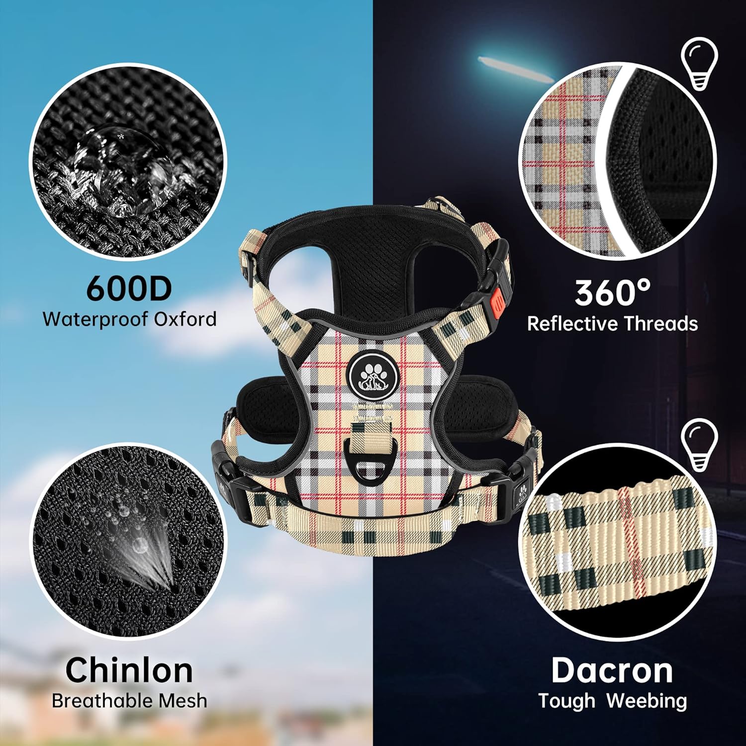 NESTROAD No Pull Dog Harness with Leash, Reflective No Choke Pet Vest Harness,Adjustable Soft Padded Dog Harness with Easy Control Handle for Small Dogs(Checkered Beige,Small)