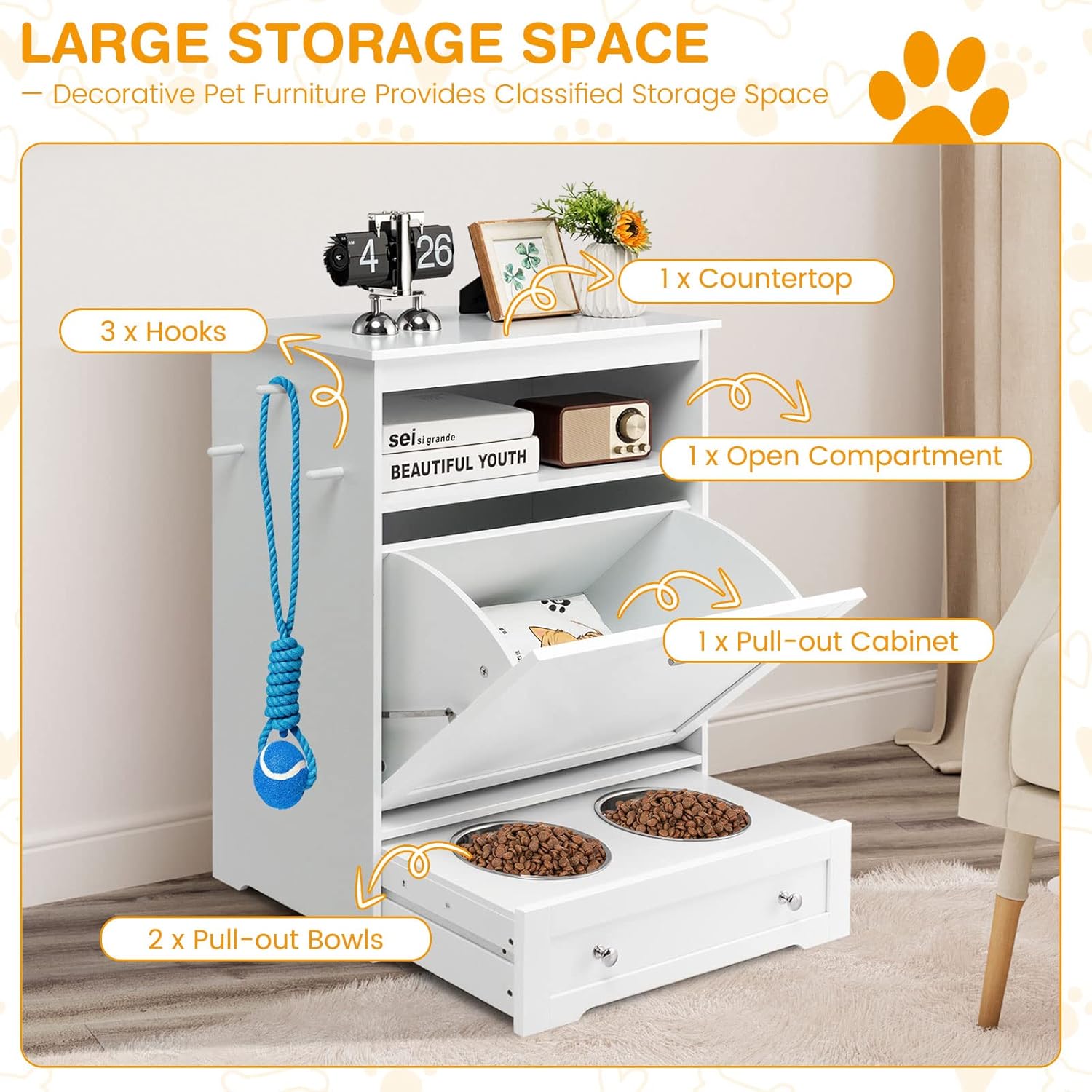 - 【Professional Design For Pets:】The pet storage cabinet features a white finish of a simple and elegant style and adds a sense of elegance to match with any of home style to act as a side table or end table. Suitable for large dogs, cats, puppies, and kittens to use with less spill.