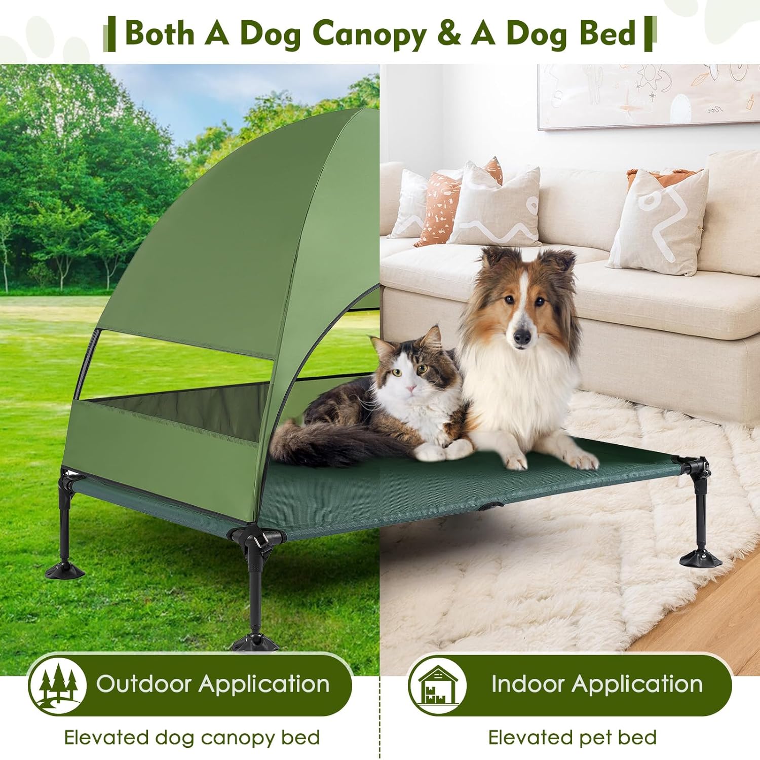 - Elevated Pet Cot With Anti-Scratch Breathable Bed Mat: features a high density teslin breathable meshing bed mat, this bed is anti-scratch, breathable and odorless, no sticking hair and can be easily cleaned up by wiping or hosing off and keep clean. With this elevated dog bed with a large canopy, our furry kids will be better protected from ground heat and scorching sun in summer and keep dry in light rain (cover is recommended in heavy rain), let them have a cozy summer!