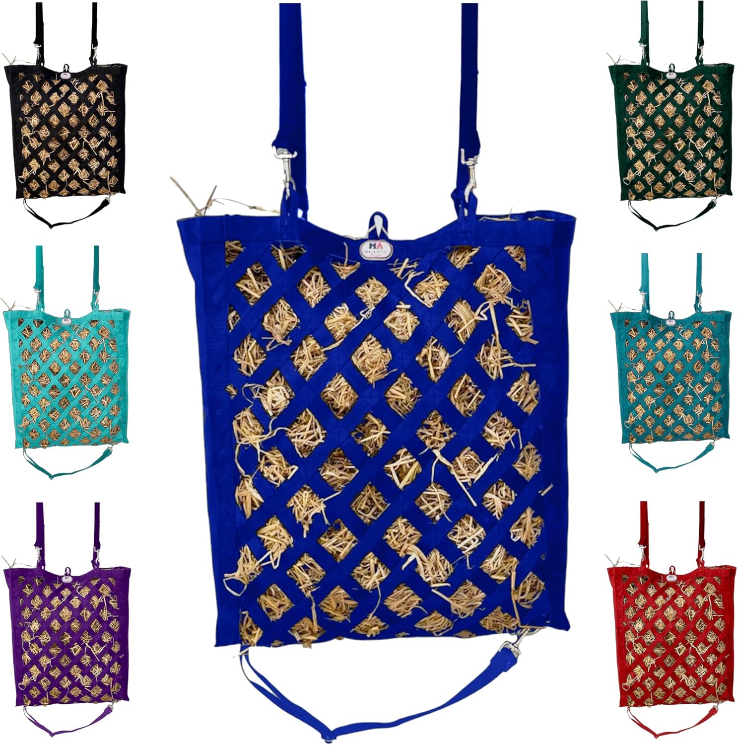 Majestic Ally Premium Nylon Hay Bag for Horses and Livestock, Simulates Grazing, Slow Feeding, Heavy-Duty PP Webbing,Quick-Adjust Straps, Small Hole for Digestion, Multiple Colors (Royal Blue)