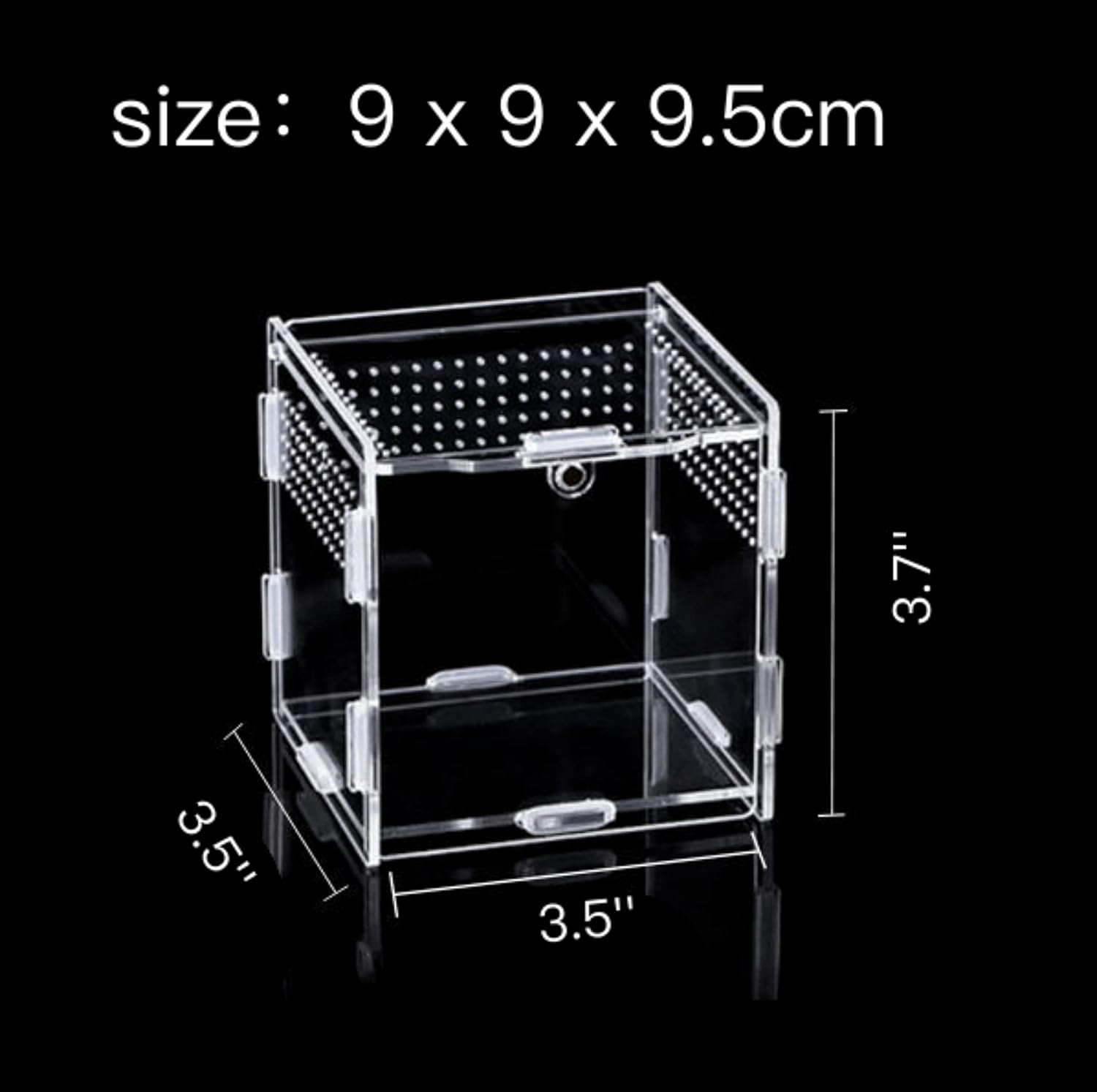 - ăMaterialăThe reptile feeding box is made of acrylic, the assembled size is 9x9x9.5cm/3.5x3.5x3.7inch,360 degree full view, completely transparent, clear and bright, so that you can see the behavior of small pets anytime, anywhere. It is easy to observe and clean.