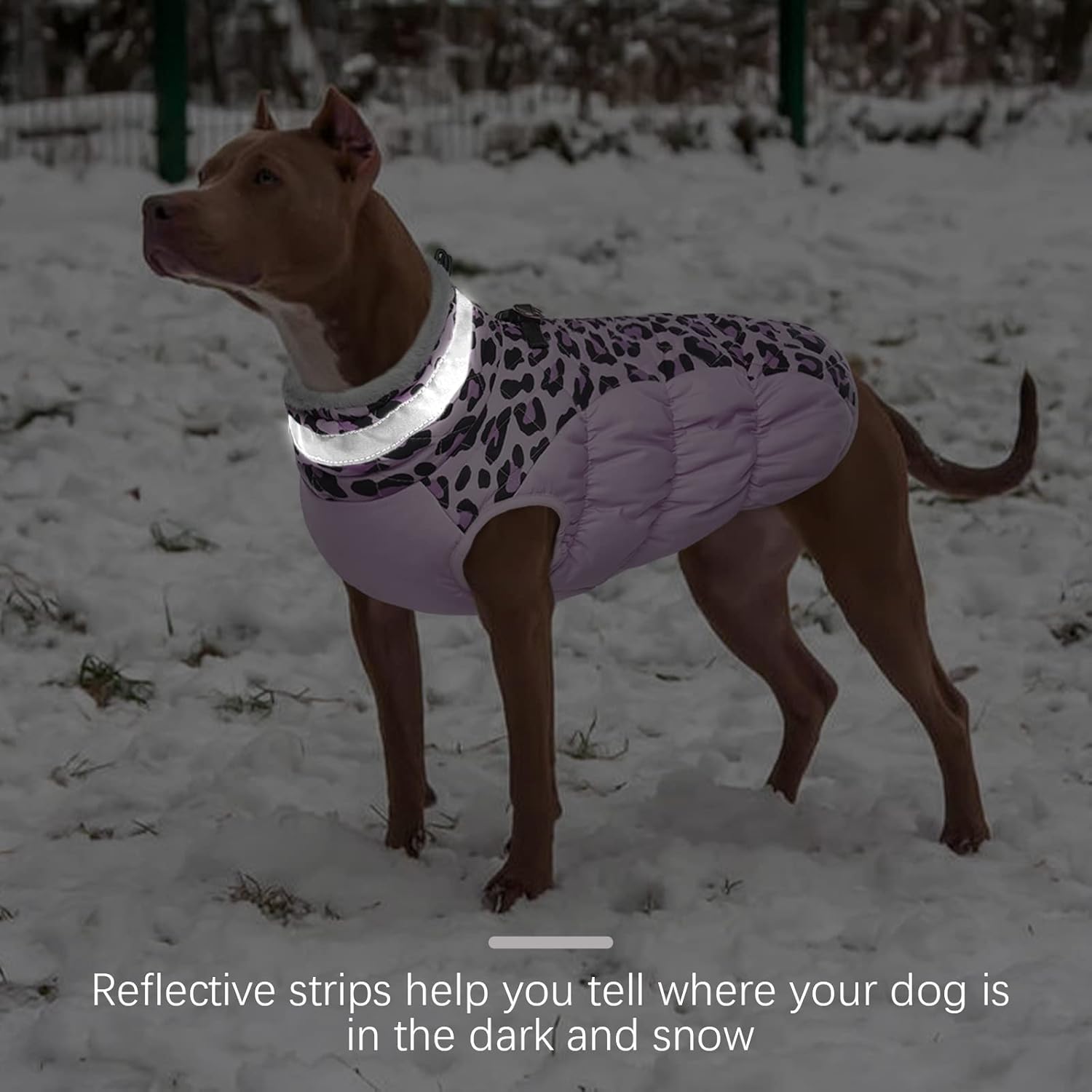 FUAMEY Dog Coat for Large Dogs,Waterproof Dog Winter Jacket with Harness Built in Puppy Cold Weather Coats Reflective Pet Vest with Zipper Warm Fleece Dogs Snowsuit Windproof Purple Leopard L