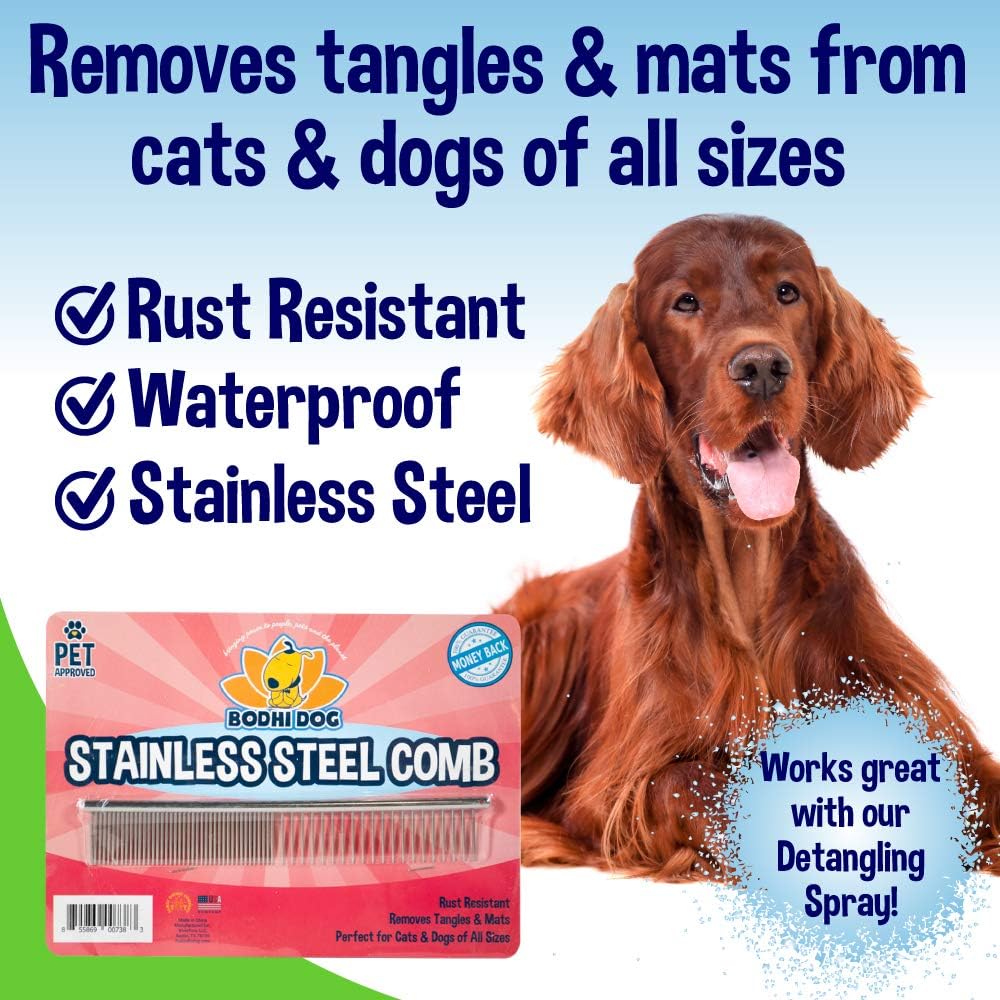 - EASY DETANGLING W/ FINE & WIDE TEETH: 2 grooming tools in one! Our detangler comb has fine & wide tooth spacing on opposite ends allowing you to easily detangle, finish & fluff your entire pet. Works great on the muzzle, chin, body, hindquarters front, back legs & tail. Use it to remove stubborn mats, tangles, loose fur, and dirt. The teeth are blunt and slightly rounded to not irritate or scratch your petโs skin while grooming and removing a mat, tangle, or clump of fur.