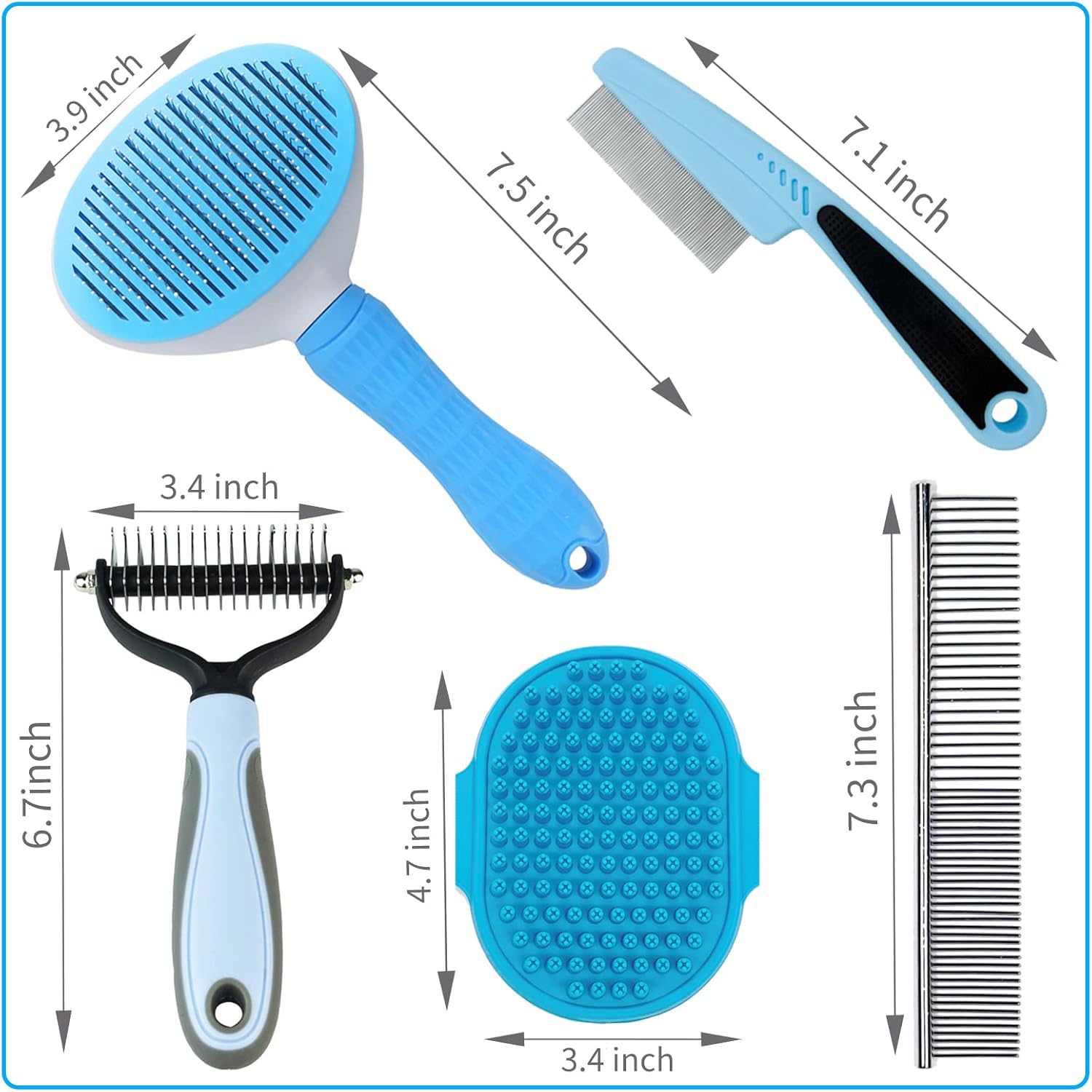 - 【VARIOUS GROOMING TOOLS】 1.Rubber bath brush can take a Massage expenience to pets when showering. 2.Self-Cleaning brush with unique particles, removing the loose hair gently. 3.Double-side dematting Rake can reduce the shedding hair. 4.Stainless Steel comb with rounded teeth, would remove the undercoat knots tangles. 5.Flea comb could clear up the flea infestation.