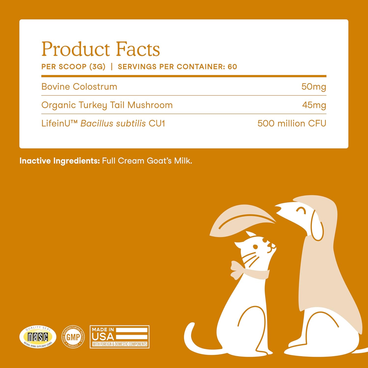 - No fillers: Formulated with Bacillus Subtilis cat probiotic and dog probiotic, as well as colostrum and turkey tail mushroom for immune system regulation; made with full cream goat milk for easy digestion