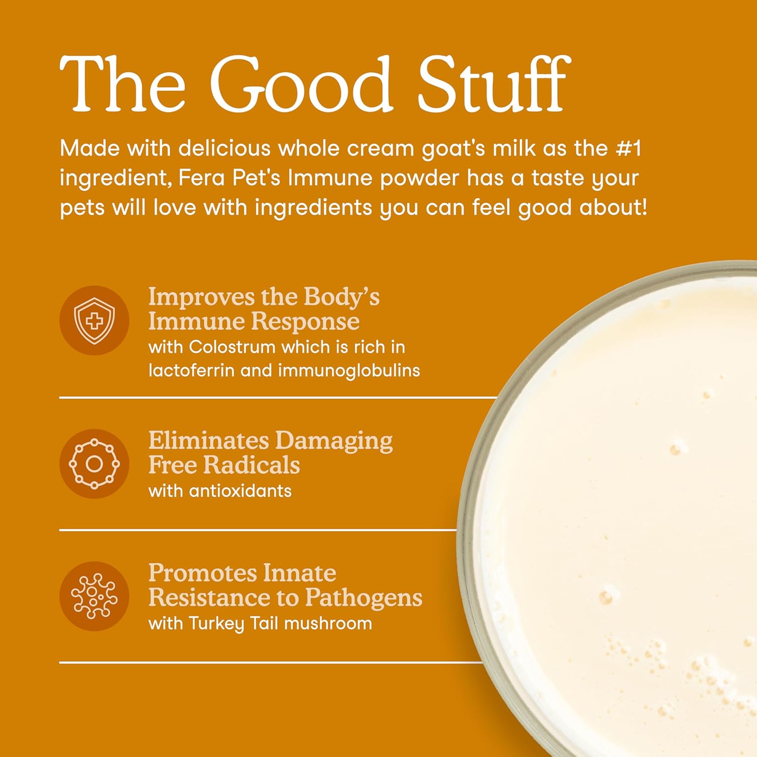 - Immune system strength: Fera’s Immune goat milk topper contains a probiotic for dogs and cats, plus other powerful ingredients to strengthen their immune and digestive systems