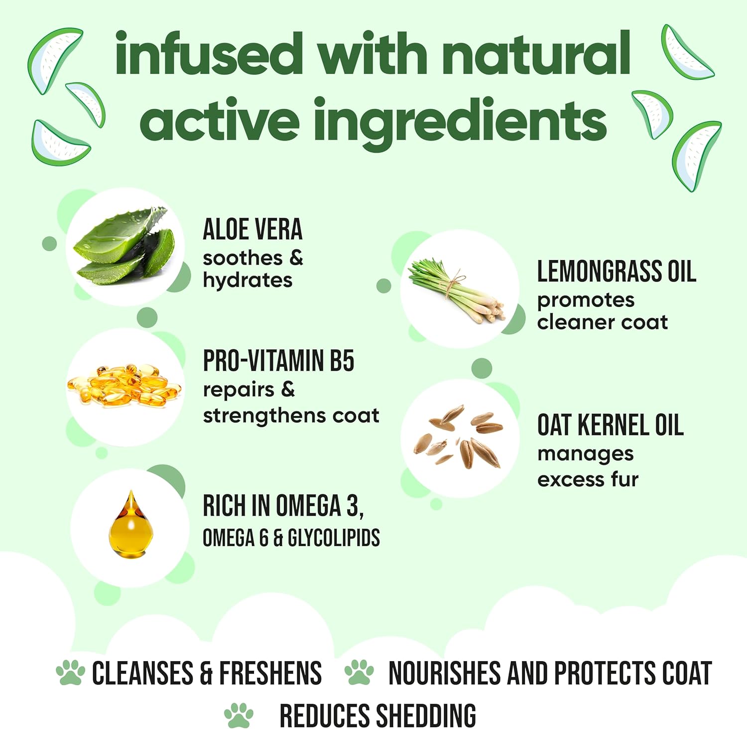 - Product Benefits : Helps minimize shedding, promotes healthy skin, and nourishes the coat with a blend of omega 3 & 6, glycolipids, aloe vera, lemongrass, and pro-vitamin B5. Helps minimize shedding, promotes healthy skin, and nourishes the coat with a blend of omega 3 & 6, glycolipids, aloe vera, lemongrass, and pro-vi… See more