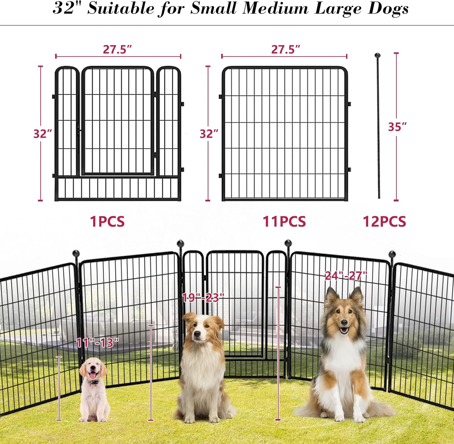 - 【Upgraded Size & Large Space】: Our dog fence outdoor for yard measures 27.5"W x 32" H, offering a larger comfortable space for your furry friends. With 10-32 panels of different sets, the pet fence provides a maximum space of 669 square feet. Suitable for medium/small animals, like Labrador dogs, golden dogs, cats, rabbits, ducks, chickens, and more