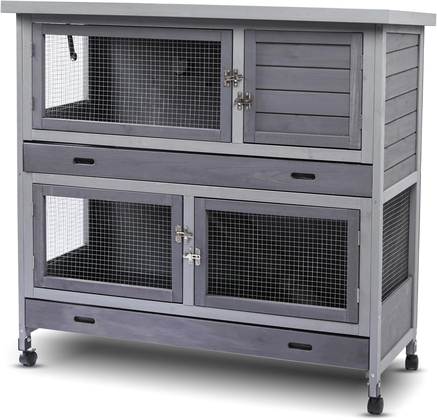 Rabbit Hutch Bunny Cage Indoor Outdoor with Wheel Deeper Tray Chew Proof Guinea Pig Cages 2 Decks Large Rabbit House with 4 Wooden Doors Weatherproof 41.3" L*17.3" W*41.3" H