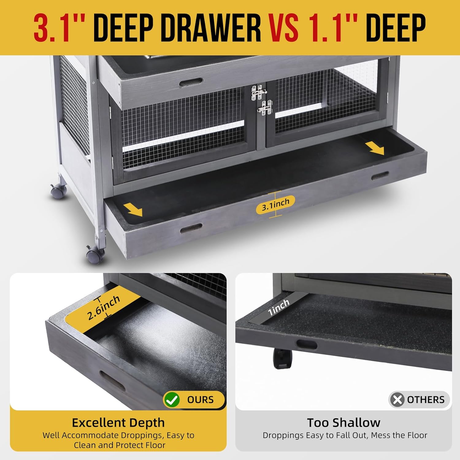 - 【Roomy Space & Easy Cleaning】Double levels (39.5" L*16.9" W of each) up to 9.2ft² in total, this rabbit hutch provides sufficient space for 2 small to mid size of bunnies to live. 2 pull out trays (2.6'' deep of each) made of hard plastic with wooden supports slide in and out for easy cleaning