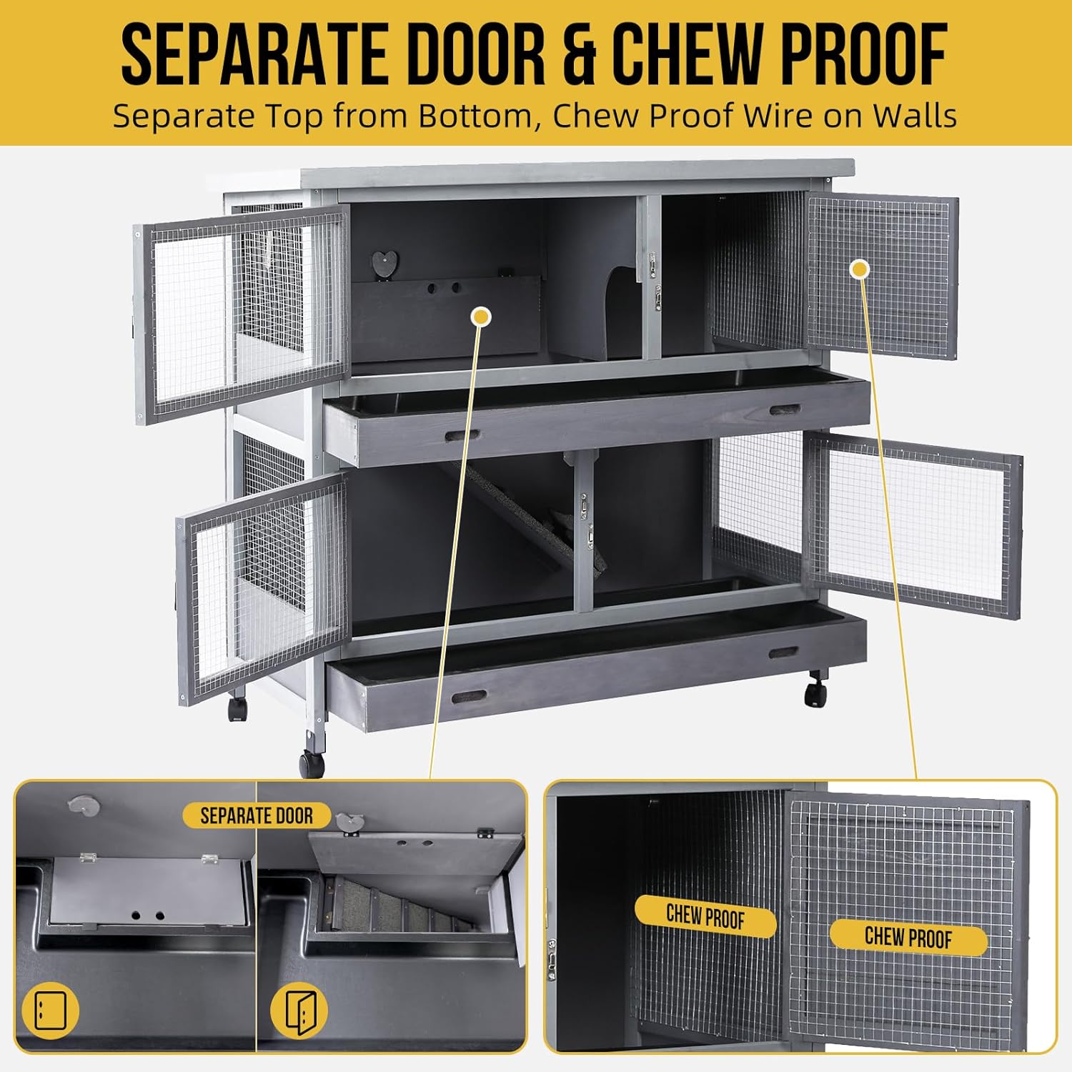 - 【Superb Mobility & Easy Access】On 4 lockable wheels, this bunny hutch is easy to move into private area when you have company or move it outside to get some sun. All doors with metal latch on front are openable and entire top can raise up on strong hinge for easy access