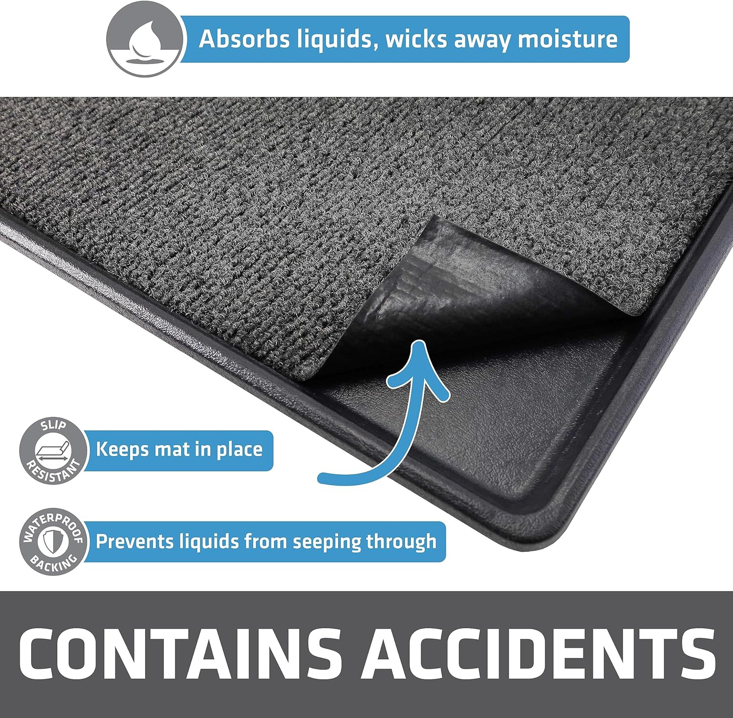 - ABSORBENT POLYESTER FABRIC, WITH WATERPROOF BACKING (SLIP-RESISTANT): Zorb-tech Anti Flow technology quickly absorbs liquids and wicks away moisture. Features a waterproof & slip-resistant backing that prevents liquids from soaking through to the surface below and keeps the mat securely in place.