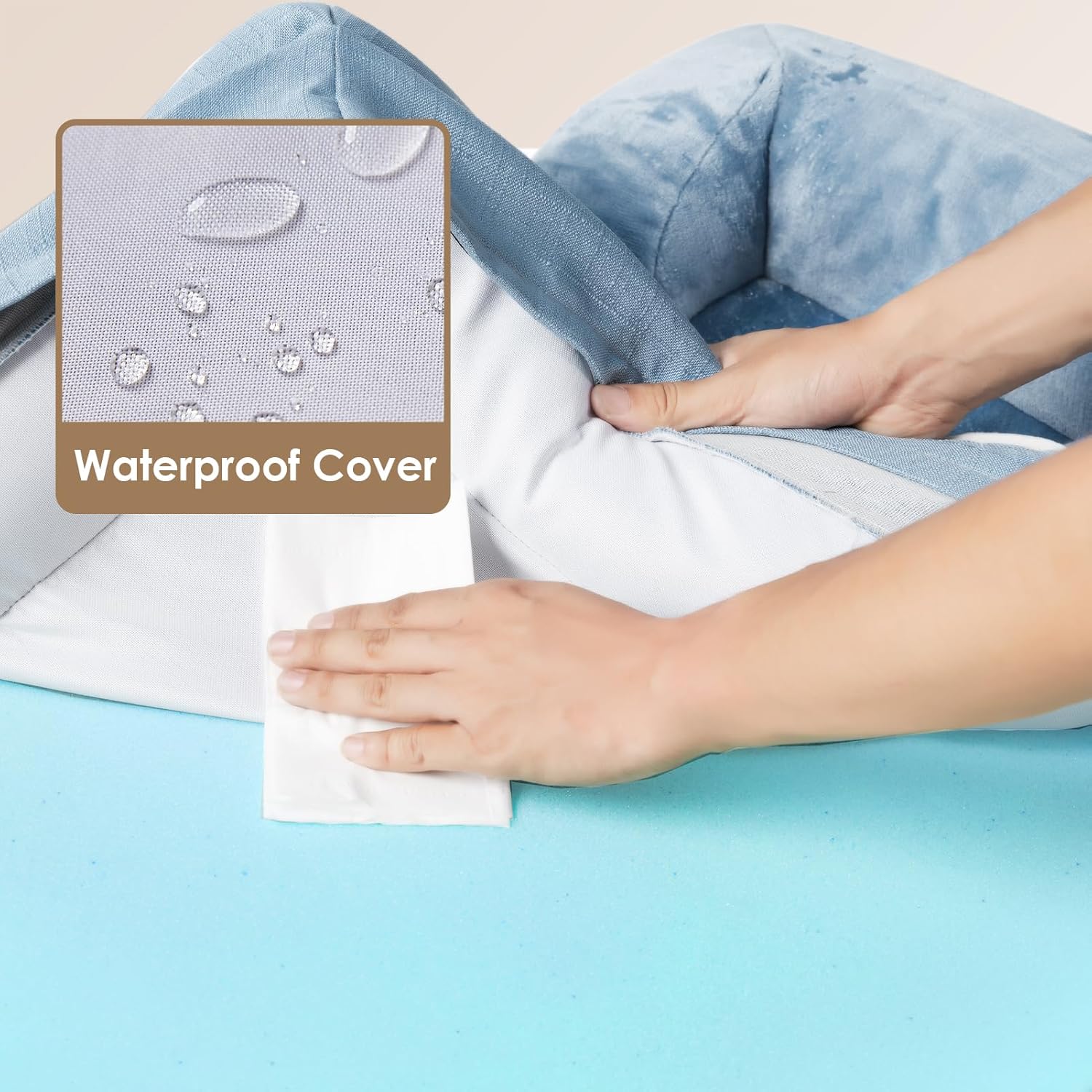 - WATERPROOF COVER: A waterproof film is positioned between the fleece surface and the bottom fabric, ensuring the dog bed remains dry. However, the faux linen sides are not waterproof.