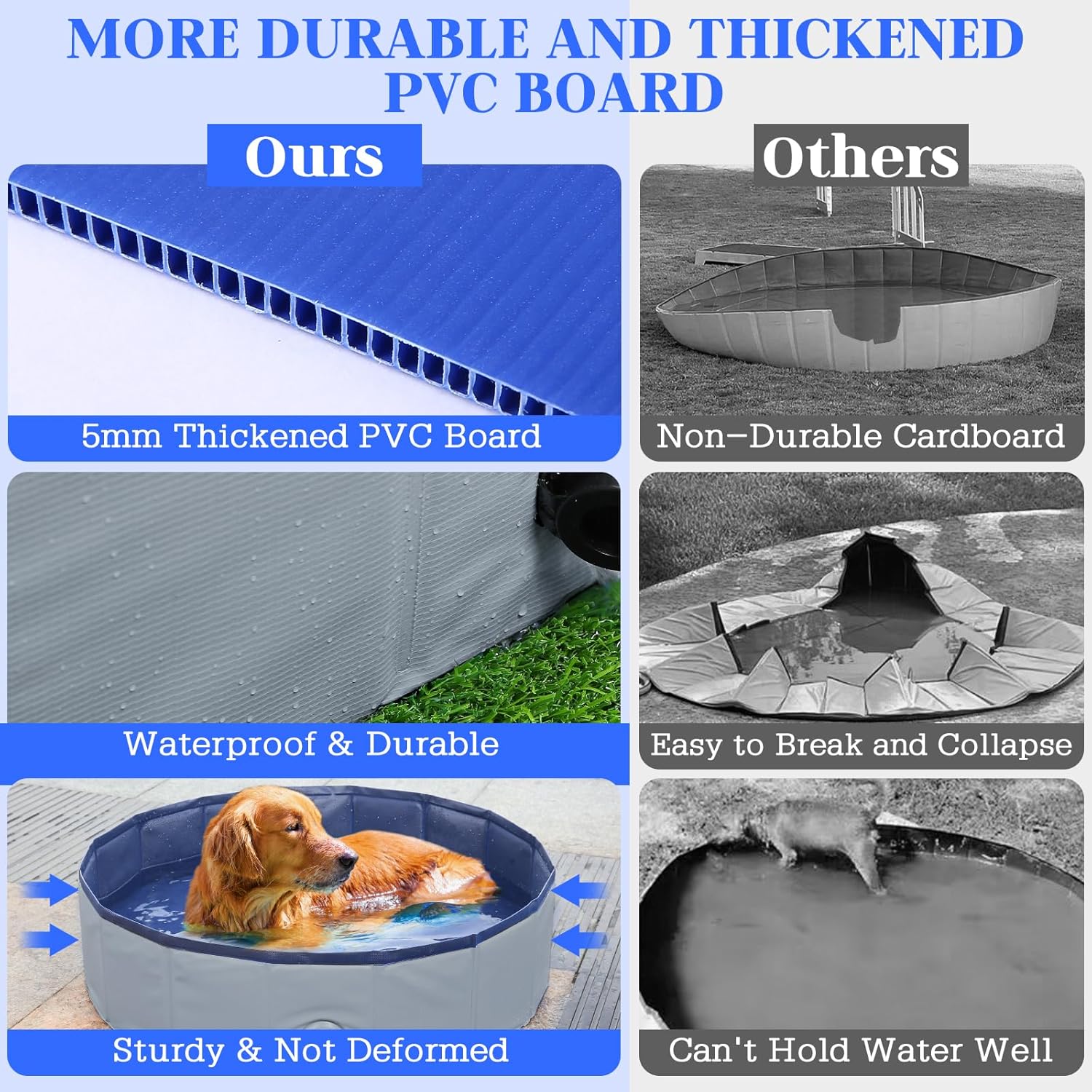 - 【High-quality Material, Sturdy Durable】The dog pool / kids pool is made of high-density fiberboard and high-quality PVC material. Strong enough and uneasy to collapse and deform. The bottom is made of abrasion resistant non-slip textured fabric, non-toxic and waterproof, perfect water retention. It also can prevent your pets from slipping when they jump around in the bath pool. Tips: Please trim your puppy's nails to prevent damage or leakage to the inner wall.