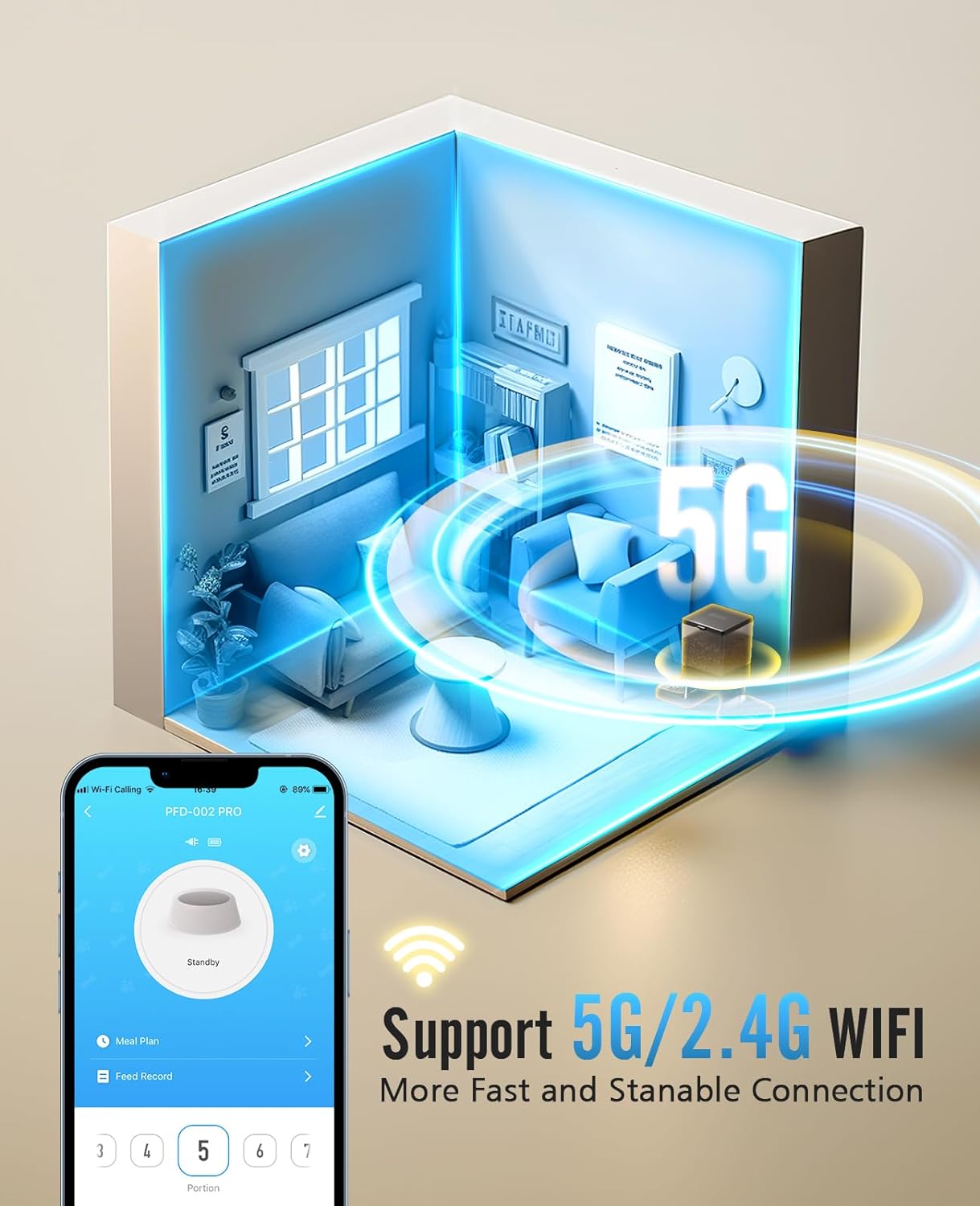 - 5G Stable Wi-Fi Connection: oneisall automatic cat food dispenser can connect to 5G/2.4G Wi-Fi. Compared to 2.4G Wi-Fi, this feeder with 5G feature would connect to network more stably. You donβt need to worry about failing to control when you are out of home