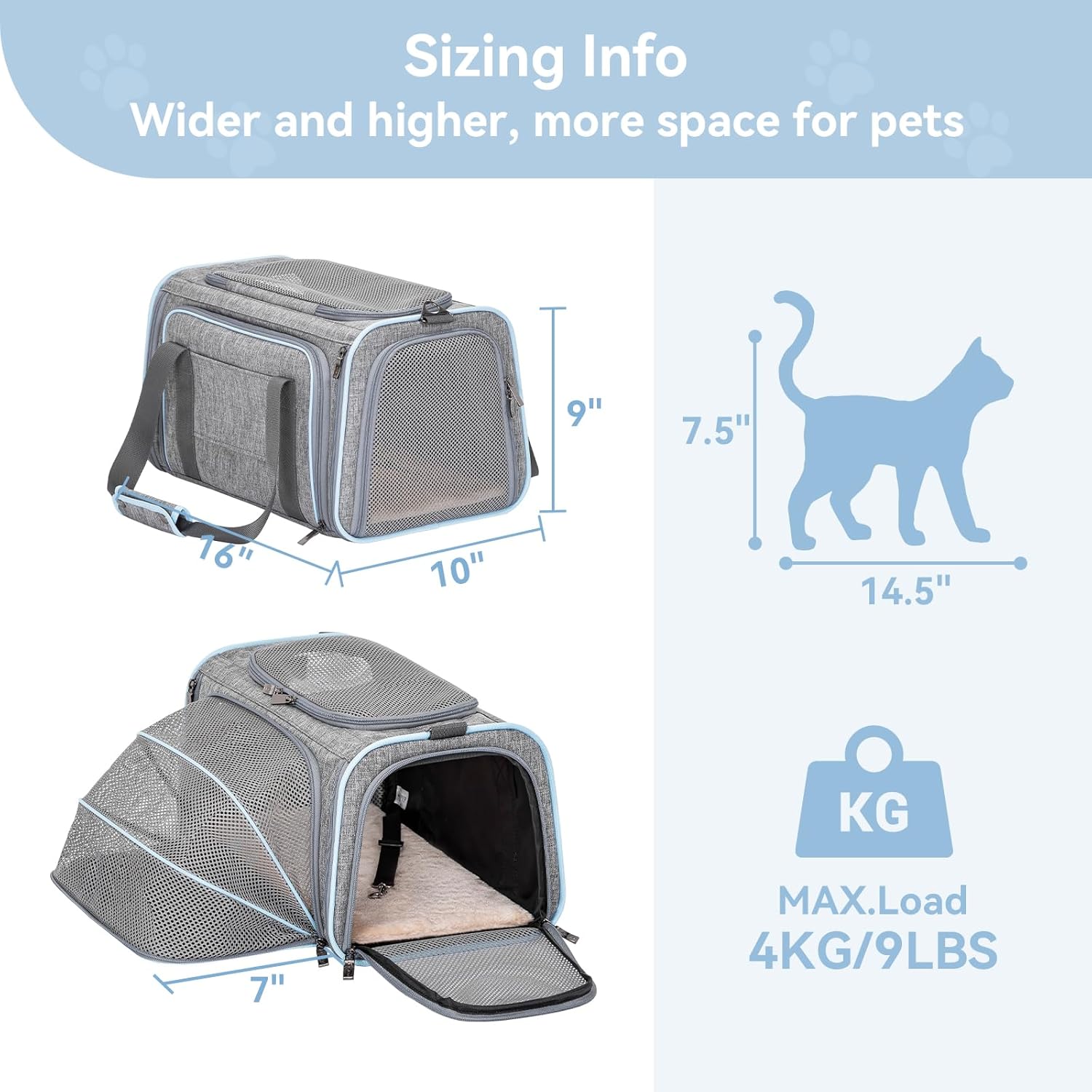 - 【Dimension】The S size of pet the pet carrier is 16"Lx 10"Wx 9"H and expandable size is 17.3"Lx16"Wx 9"H by expanding the 1 mesh window. This small cat carrier weighs about 2.1 pounds and is suitable for small pets under 9 pounds, such as kittens, small dogs like Chihuahua, rabbits, or other small animal. Please verify measurements prior to booking