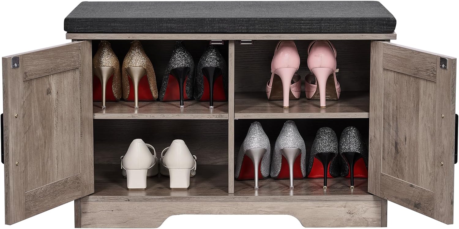 - Keep Your Shoes Organized: The depth of bench is 13.8 inches, which makes it easily to put in your shoes, meanwhile shoes of various heights can be placed by adjusting middle movable boards. The bench doors design ensures not only your privacy, but also a tidy space