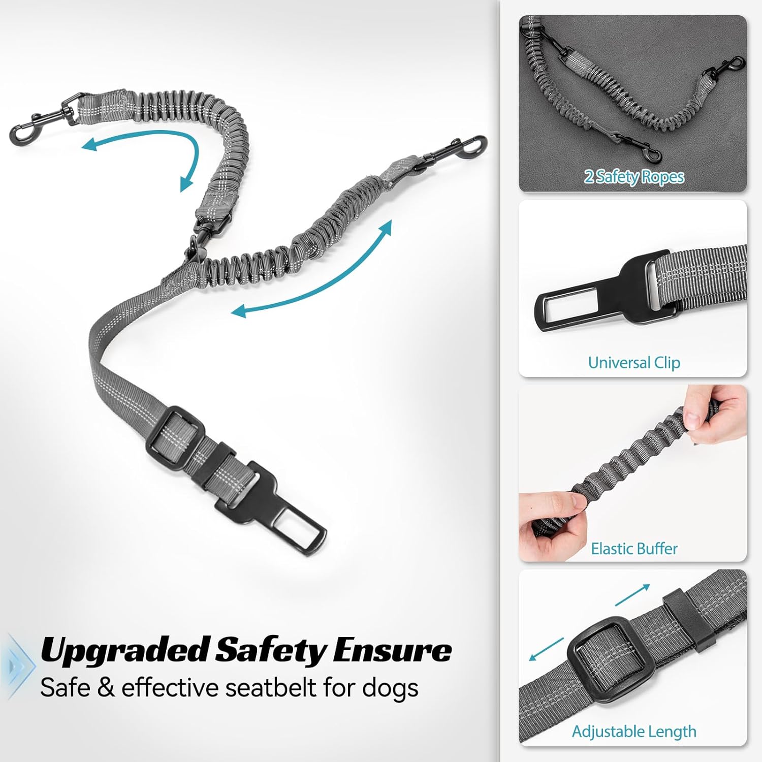 - [Upgraded Safety Rope] The car seat for dogs comes with an upgraded leash, that directly connects the pet vest to the car seat belt buckle through a special seat belt tongue. The elastic buffer design can protect your dog from sudden braking or sharp turns. Removable safety rope suitable for 1 or 2 pets.